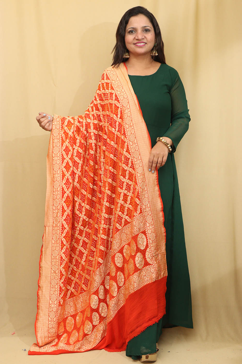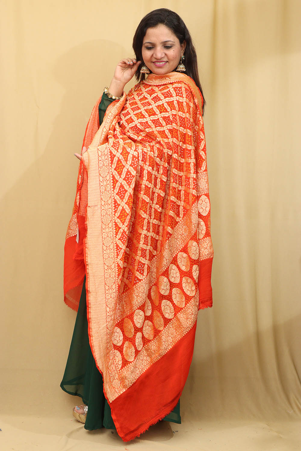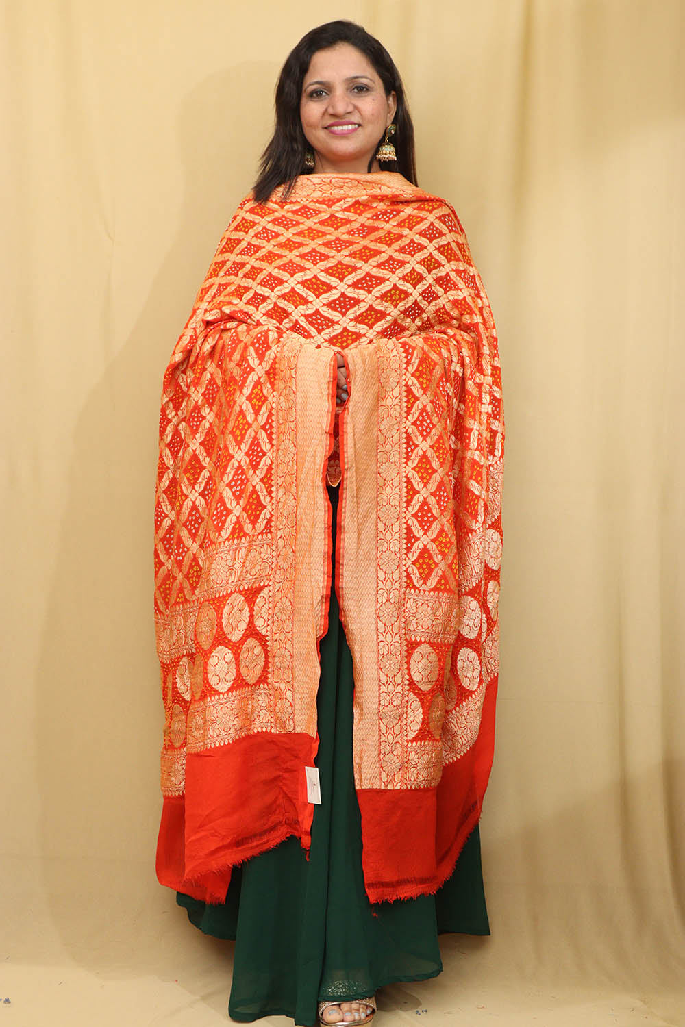 This Banarasi Bandhani Pure Georgette Dupatta is a stunning piece of traditional Indian craftsmanship. Made from luxurious georgette fabric, this dupatta features intricate bandhani tie-dye patterns. The addition of bandhej work adds a touch of opulence and elegance to this already exquisite banarasi piece. Perfect for special occasions or festive events, this dupatta is sure to make a statement wherever you go. Special features: 1. Handcrafted bandhani tie-dye patterns 2. Luxurious pure georgette fabric 3. Rich color 4. Intricate meenakari work 5. Perfect for special occasions 6. Adds a touch of elegance to any outfit 7. Statement piece for festive events