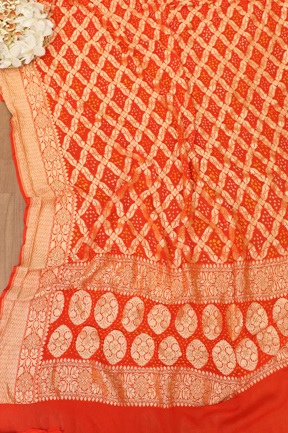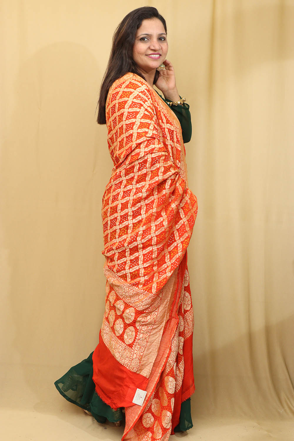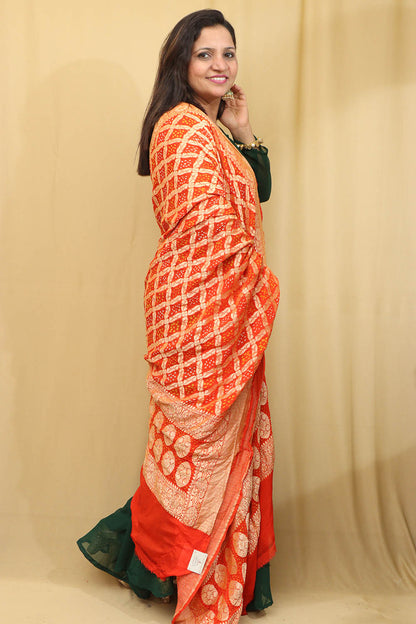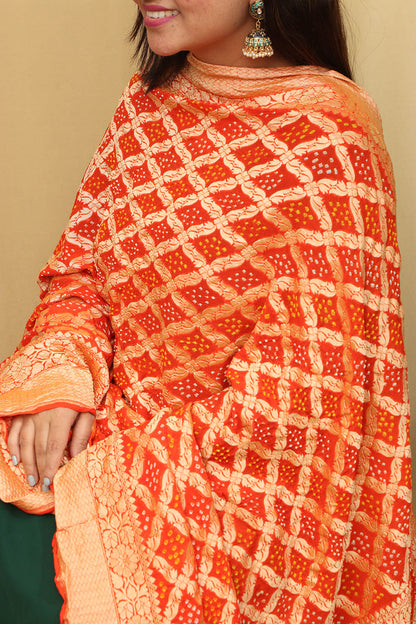 This Banarasi Bandhani Pure Georgette Dupatta is a stunning piece of traditional Indian craftsmanship. Made from luxurious georgette fabric, this dupatta features intricate bandhani tie-dye patterns. The addition of bandhej work adds a touch of opulence and elegance to this already exquisite banarasi piece. Perfect for special occasions or festive events, this dupatta is sure to make a statement wherever you go. Special features: 1. Handcrafted bandhani tie-dye patterns 2. Luxurious pure georgette fabric 3. Rich color 4. Intricate meenakari work 5. Perfect for special occasions 6. Adds a touch of elegance to any outfit 7. Statement piece for festive events