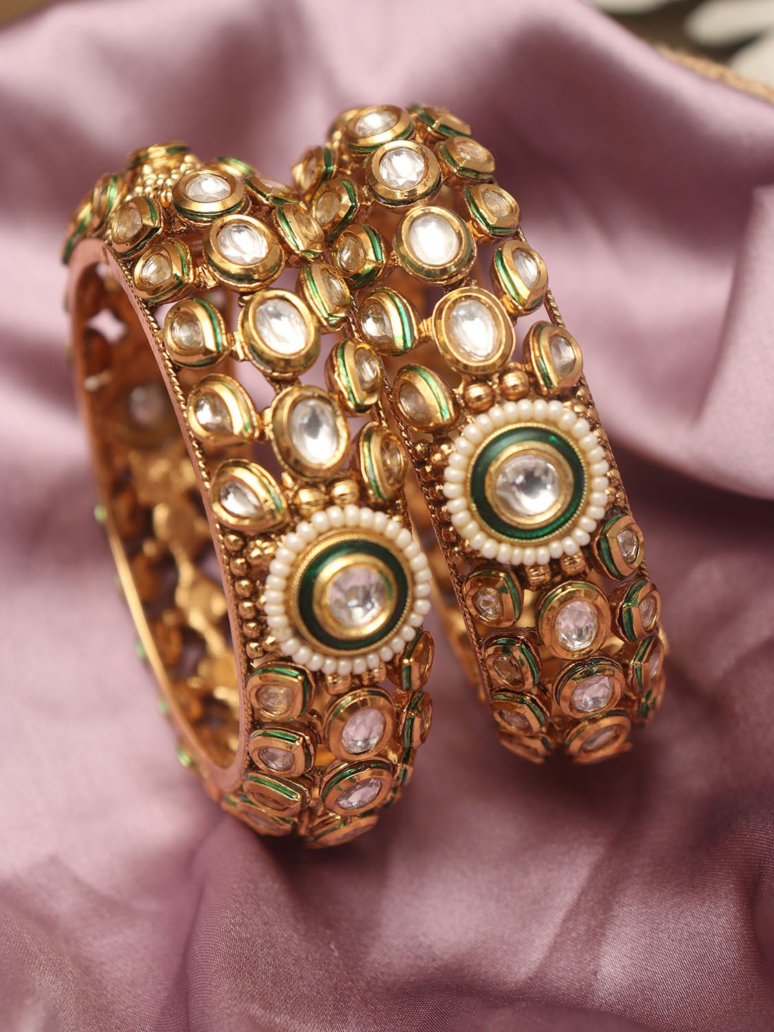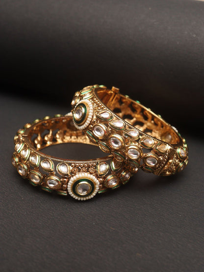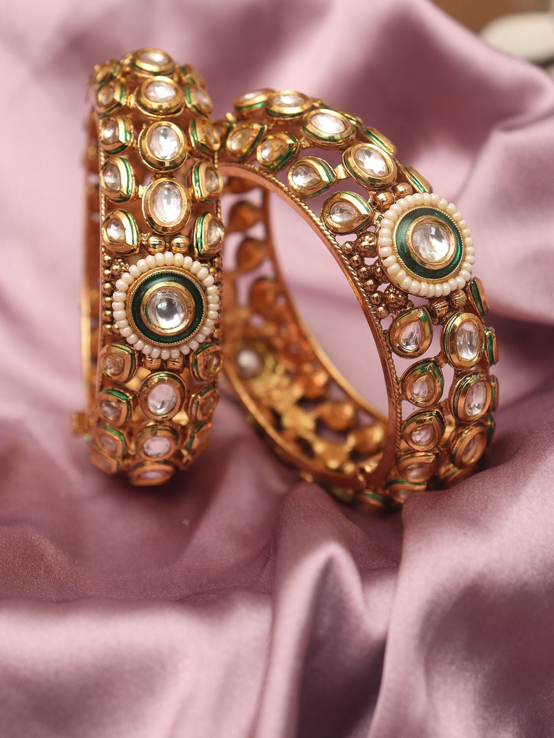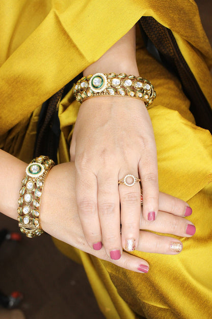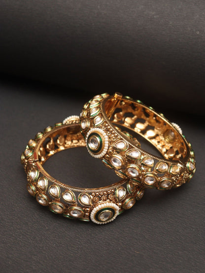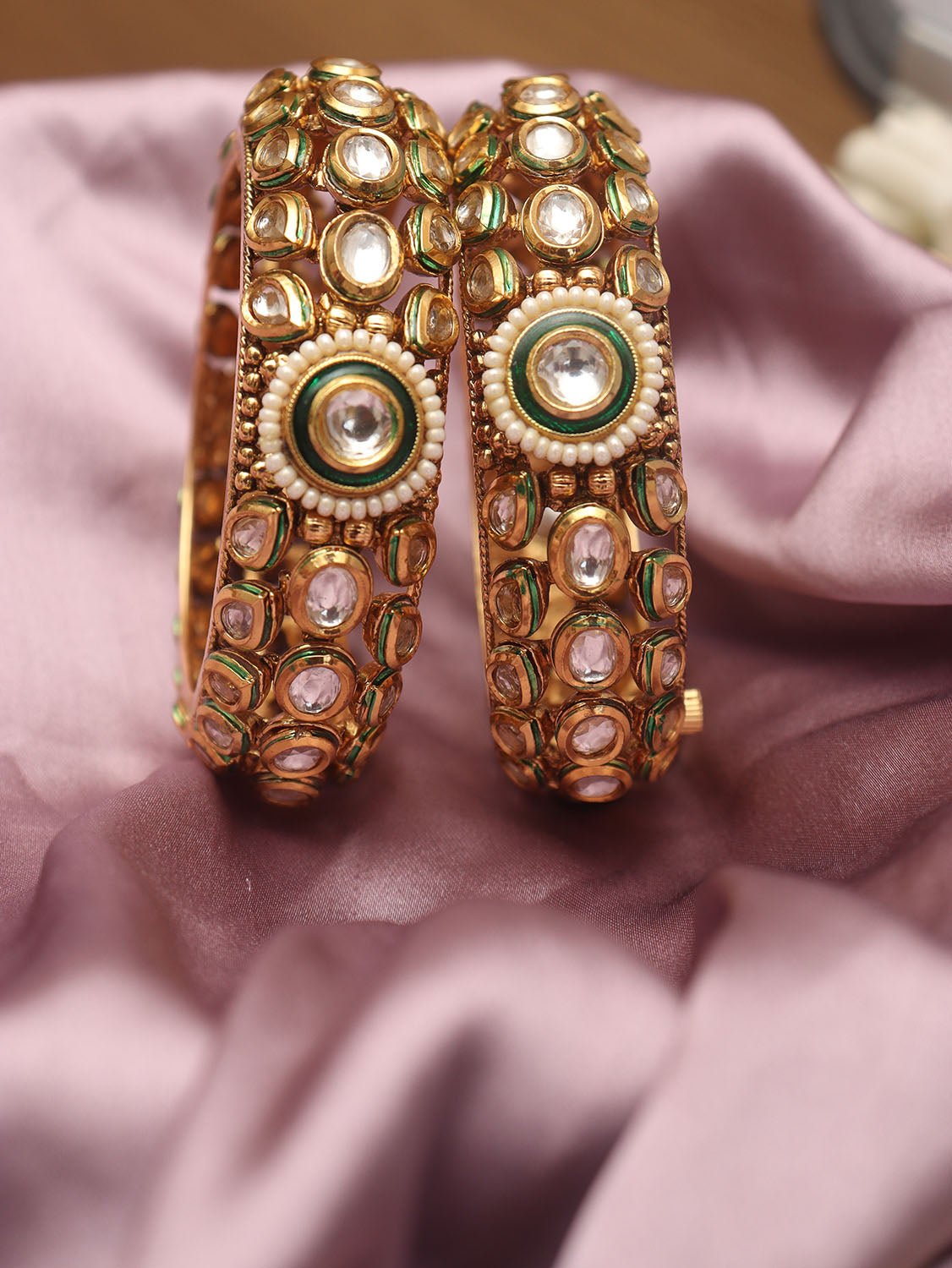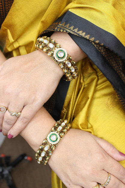 Enhance your ethnic look with Luxurion World's Indian Charm Bangle Set. Made of high-quality golden brass, these bangles are perfect for adding a touch of elegance and tradition to any outfit. The intricate design and craftsmanship of these bangles make them a must-have accessory for any fashion-conscious woman.