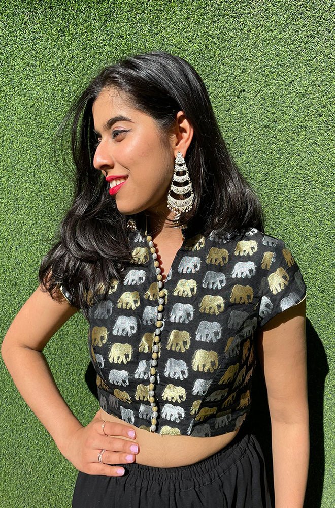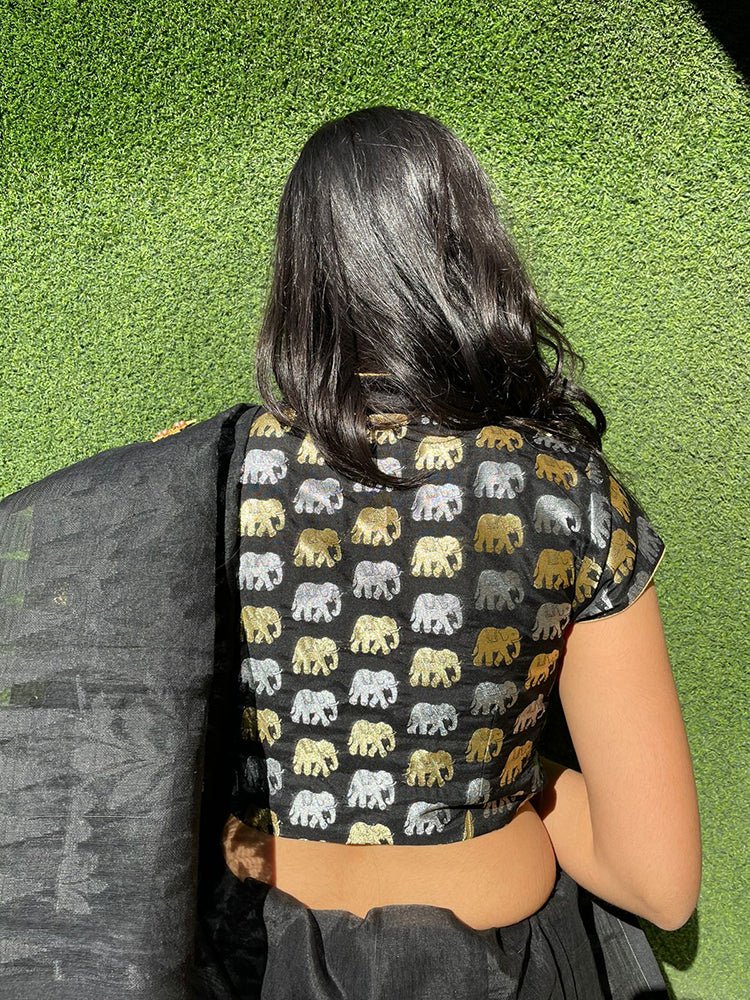 Black Banarasi Silk Potli Botton Padded Sona Roopa Elephant Design Blouse