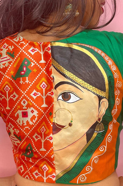 This unique U-neck blouse is a fusion of two artistic techniques, combining green Patola weaving with hand-painted motifs on pure silk fabric. The deep green Patola weave creates a rich, textured background, while hand-painted designs add intricate detailing. The non-padded stitching offers a natural and comfortable fit. This blouse blends traditional craftsmanship with contemporary style, making it an eye-catching and versatile choice for various occasions. The harmonious union of Patola weaving and hand-painted artistry results in a blouse that exudes elegance and cultural heritage, ensuring you stand out with a touch of regal charm and artistic flair.