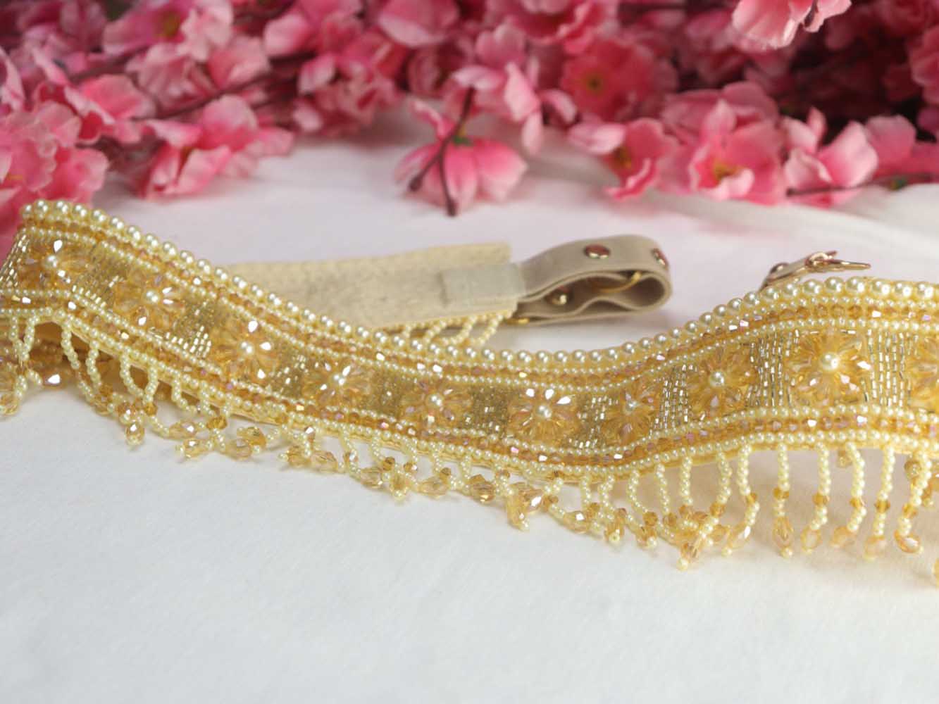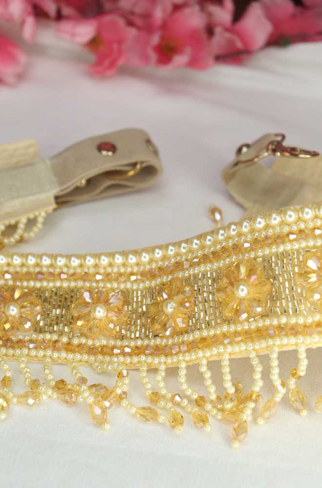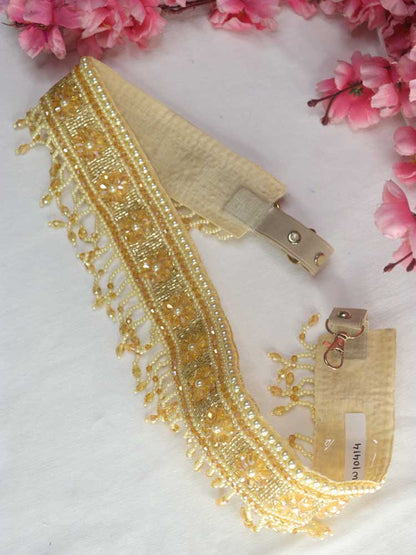 The Golden Traditional Beads Work Belt is a stunning accessory that is perfect for adding a touch of elegance to any outfit. This belt is handcrafted using traditional techniques and features intricate beadwork that is sure to catch the eye. The golden color of the beads adds a touch of luxury and sophistication to the belt, making it a must-have for any fashion-forward individual.