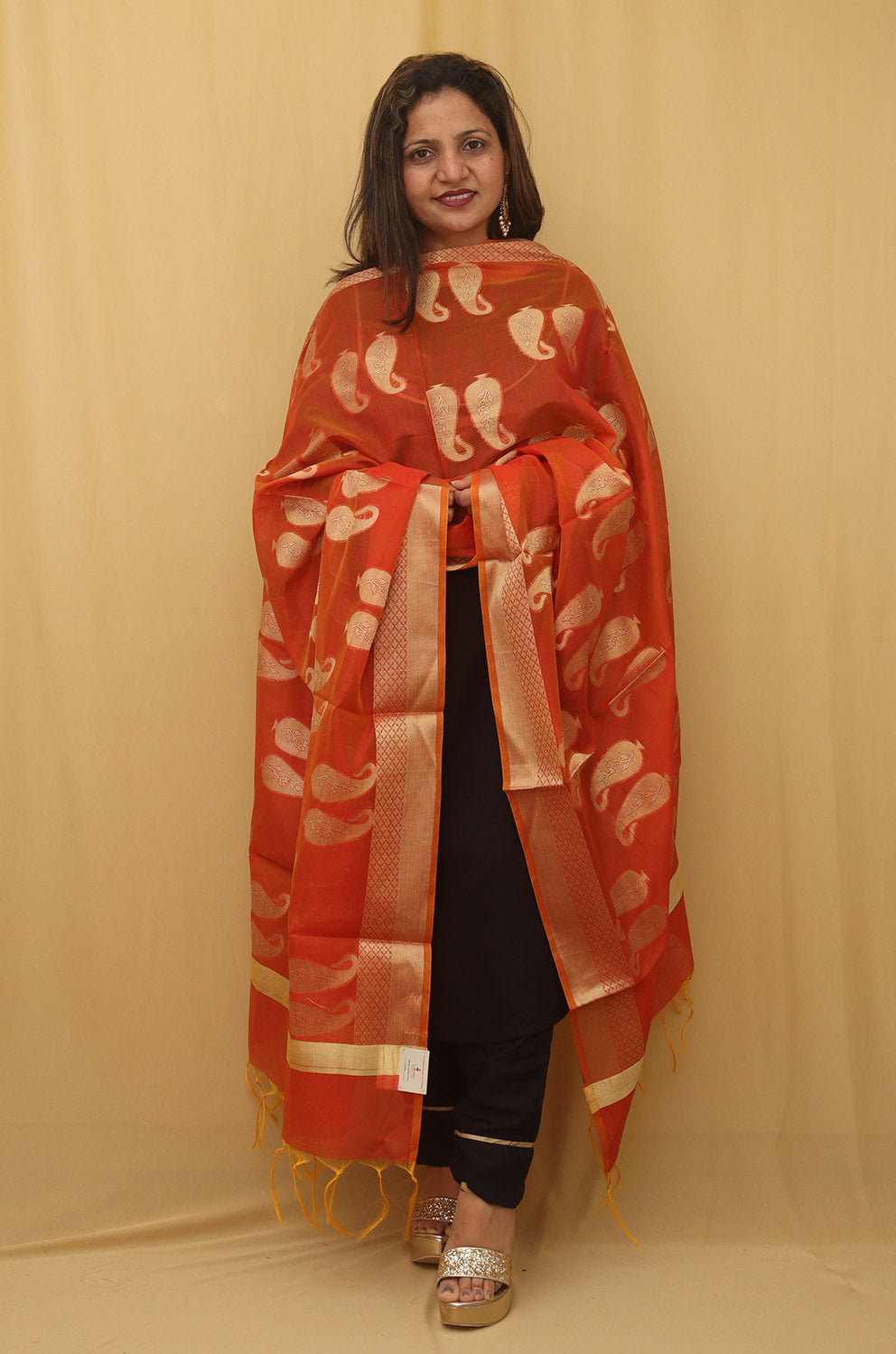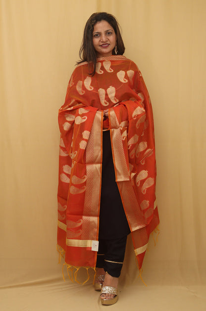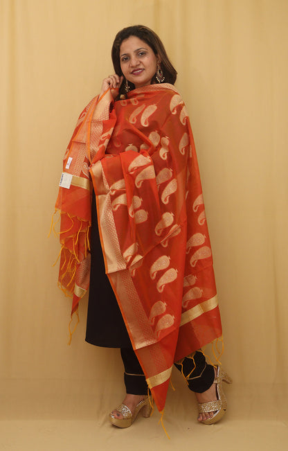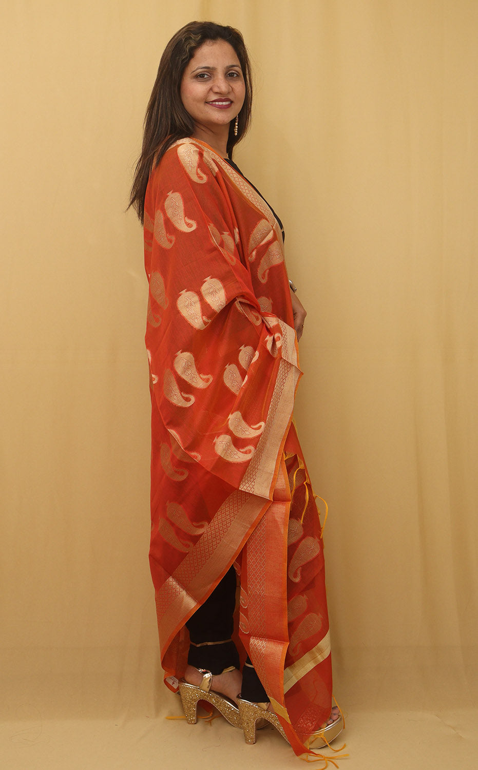 Add a touch of elegance to your ethnic ensemble with this stylish Orange Banarasi Cotton Silk Dupatta. Crafted with intricate Banarasi weaving, this dupatta exudes traditional charm and sophistication. The vibrant orange color adds a pop of color to your outfit, making it perfect for festive occasions or special events. Made from a blend of cotton and silk, this dupatta is lightweight and comfortable to wear all day long. Pair it with a plain kurta or a traditional saree to elevate your look effortlessly.