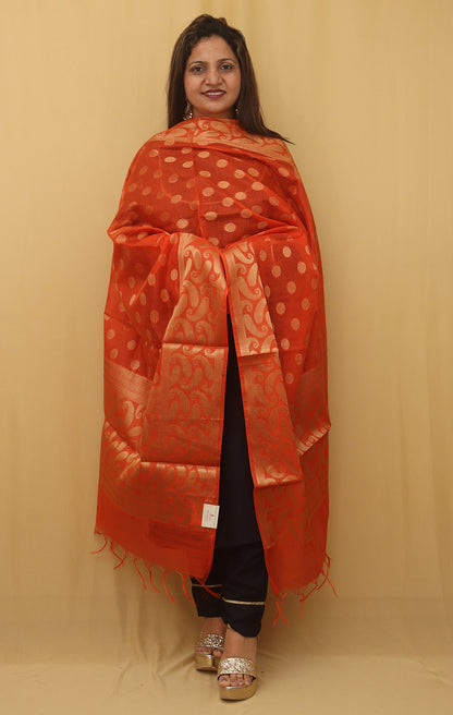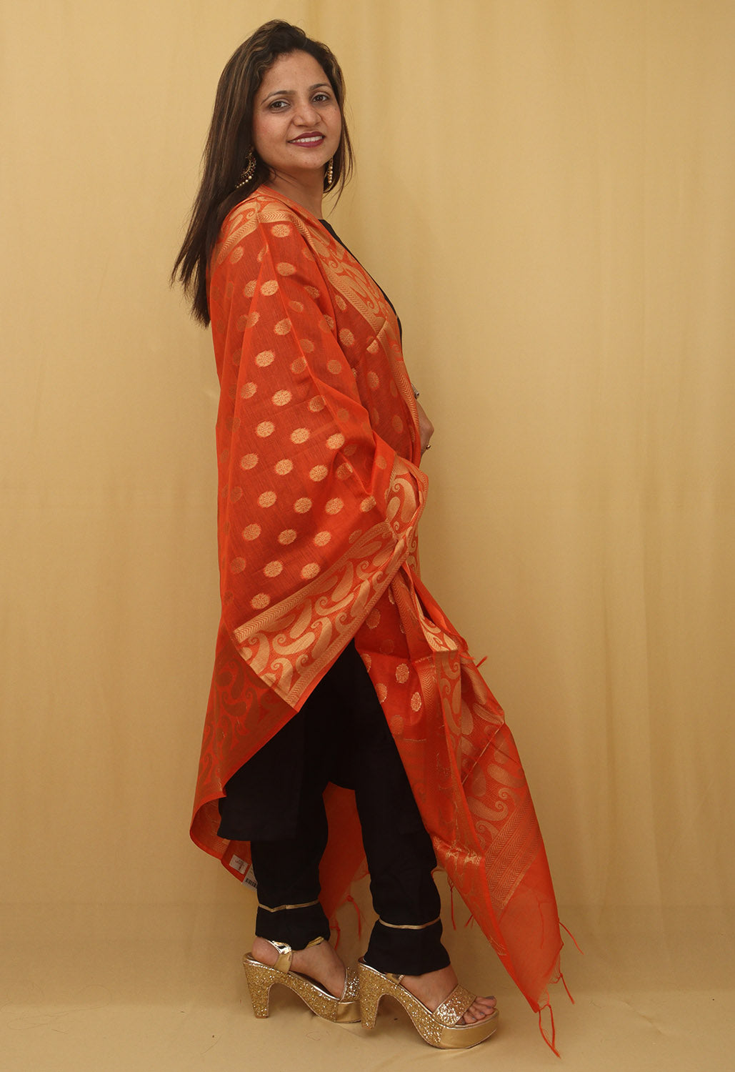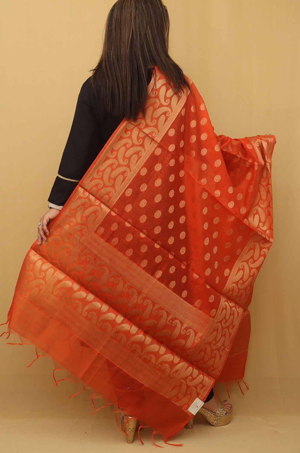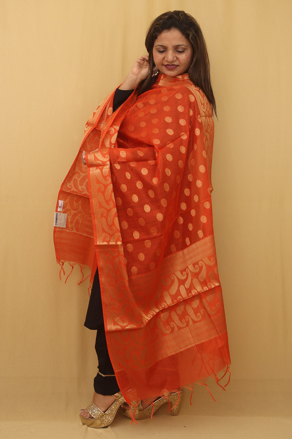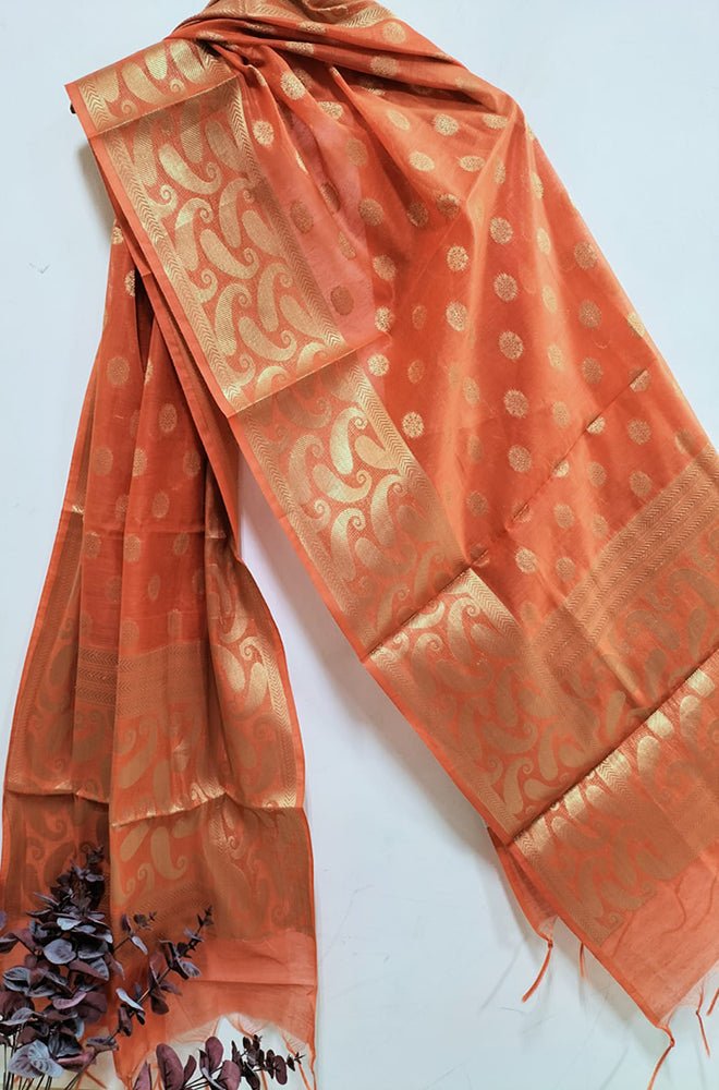 Add a pop of color to your outfit with this stunning Orange Banarasi Cotton Silk Dupatta. Made from a luxurious blend of cotton and silk, this accessory is perfect for adding a touch of elegance to any ensemble. The intricate Banarasi weaving adds a touch of traditional charm, making it a versatile piece that can be dressed up or down. Whether you're heading to a wedding or a casual outing, this dupatta is sure to make a statement.