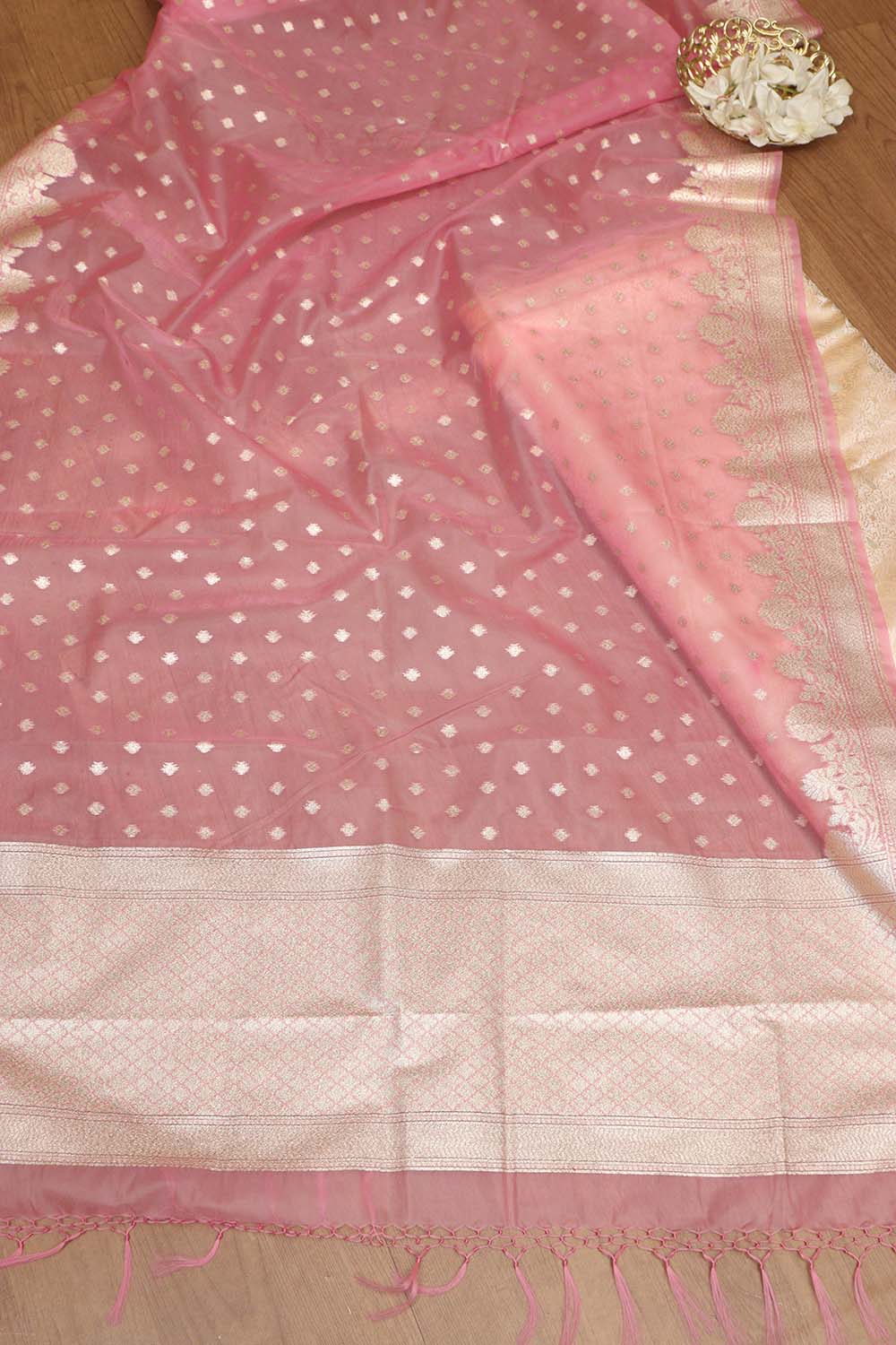 Add a touch of ethnic elegance to your outfit with this exquisite Pink Banarasi Organza Dupatta. Made from high-quality organza fabric, this dupatta features intricate Banarasi weaving in a beautiful shade of pink. The delicate design and vibrant color make it a perfect accessory for any traditional outfit. Whether you're attending a wedding or a festive celebration, this dupatta will surely make you stand out in the crowd. Its lightweight and breathable fabric ensure comfort all day long. Elevate your ethnic look with this stunning piece and make a style statement wherever you go.
