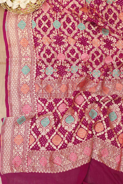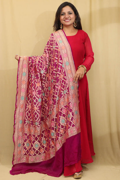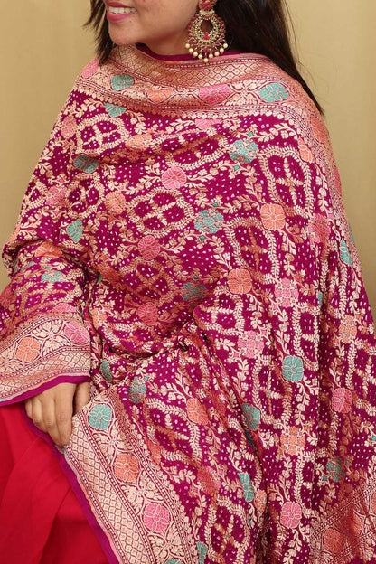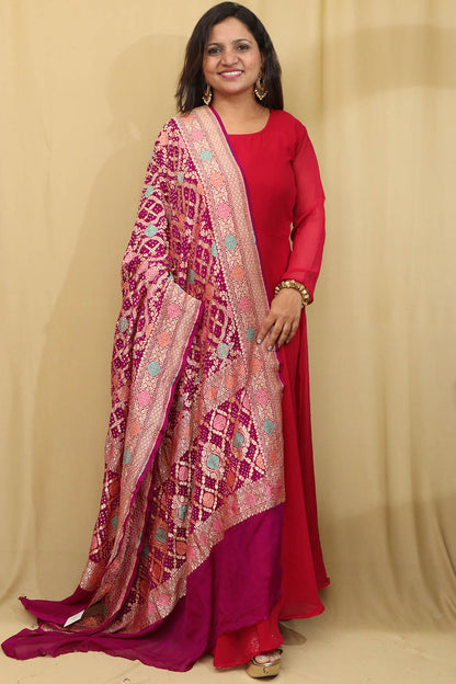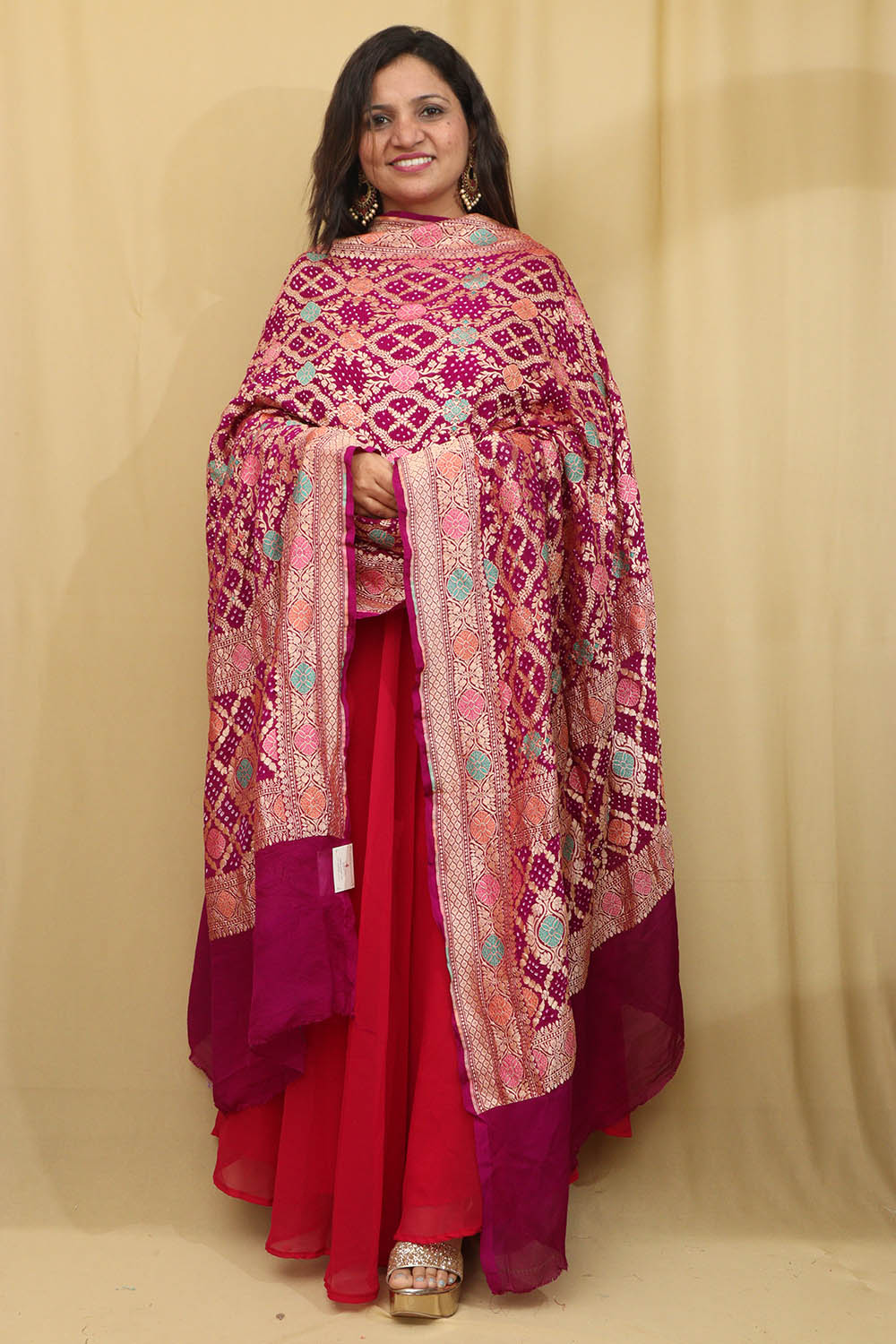 The Purple Banarasi Bandhani Pure Georgette Meenakari Dupatta is a stunning piece of traditional Indian craftsmanship. Made from luxurious georgette fabric, this dupatta features intricate bandhani tie-dye patterns in a rich purple hue. The addition of meenakari work adds a touch of opulence and elegance to this already exquisite piece. Perfect for special occasions or festive events, this dupatta is sure to make a statement wherever you go.
