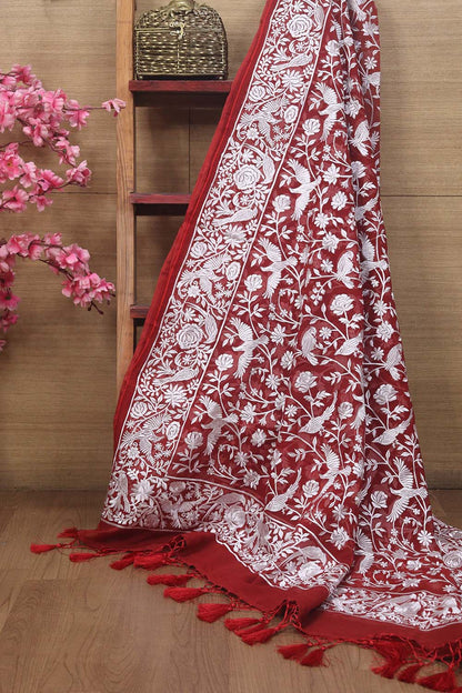 Whether you're attending a wedding, a formal event, or just want to add a touch of traditional Indian style to your everyday wardrobe, this Red Embroidered Parsi Georgette Dupatta is the perfect choice. It can be paired with a variety of different outfits, including sarees, salwar kameez, and lehengas. The lightweight and breathable fabric makes it comfortable to wear for long periods of time, while the intricate embroidery work adds a touch of elegance and sophistication to any outfit. So why wait? Add this stunning dupatta to your collection today and elevate your style to the next level!