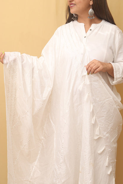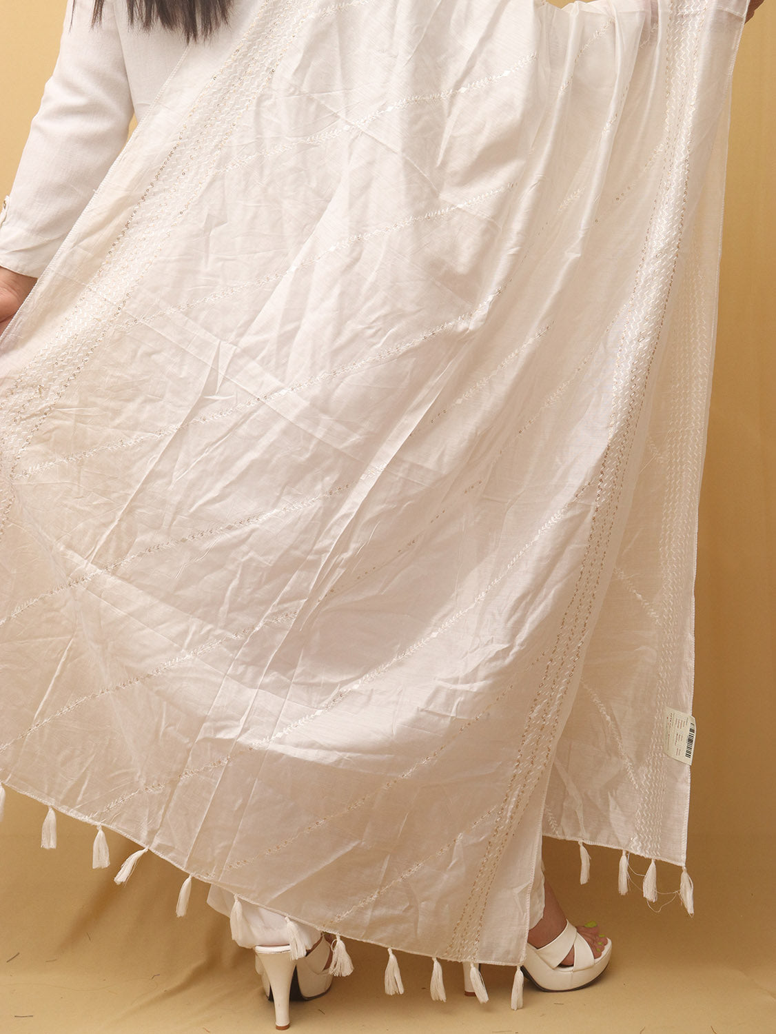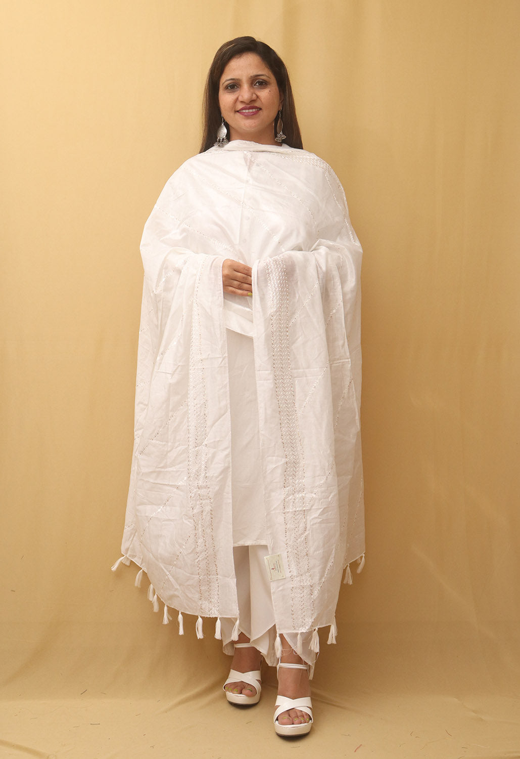 The Embroidered Trendy Chanderi Silk Dupatta exudes timeless elegance and contemporary style. Crafted from the luxurious Chanderi silk fabric, it offers a rich, lustrous texture and drapes gracefully. What sets it apart is the intricate embroidery work, showcasing exquisite patterns and motifs that add a touch of opulence. This dupatta seamlessly blends traditional craftsmanship with modern fashion, making it a versatile accessory for various occasions. The silk's sheen and the detailed embroidery make it a statement piece that elevates any ensemble, whether it's a traditional ethnic outfit or a fusion ensemble, adding a touch of sophistication and allure.