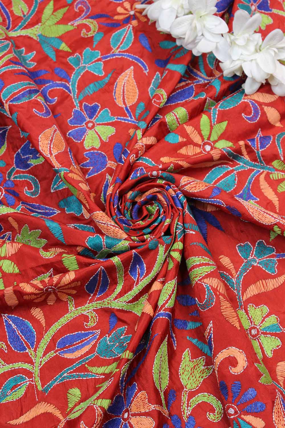 The interesting thing in this embroidery is the entire cloth is covered with running stitches, and playing beautiful motifs, of flowers animals and birds. And geometrical shapes, as well as themes from everyday activities. The stitching on the cloth gives it a slight wrinkled wavy effect.