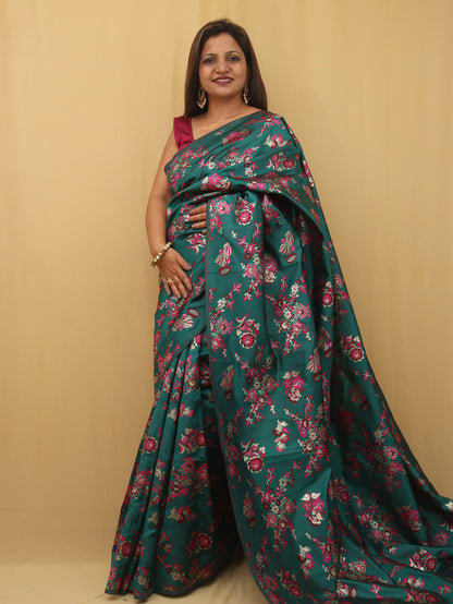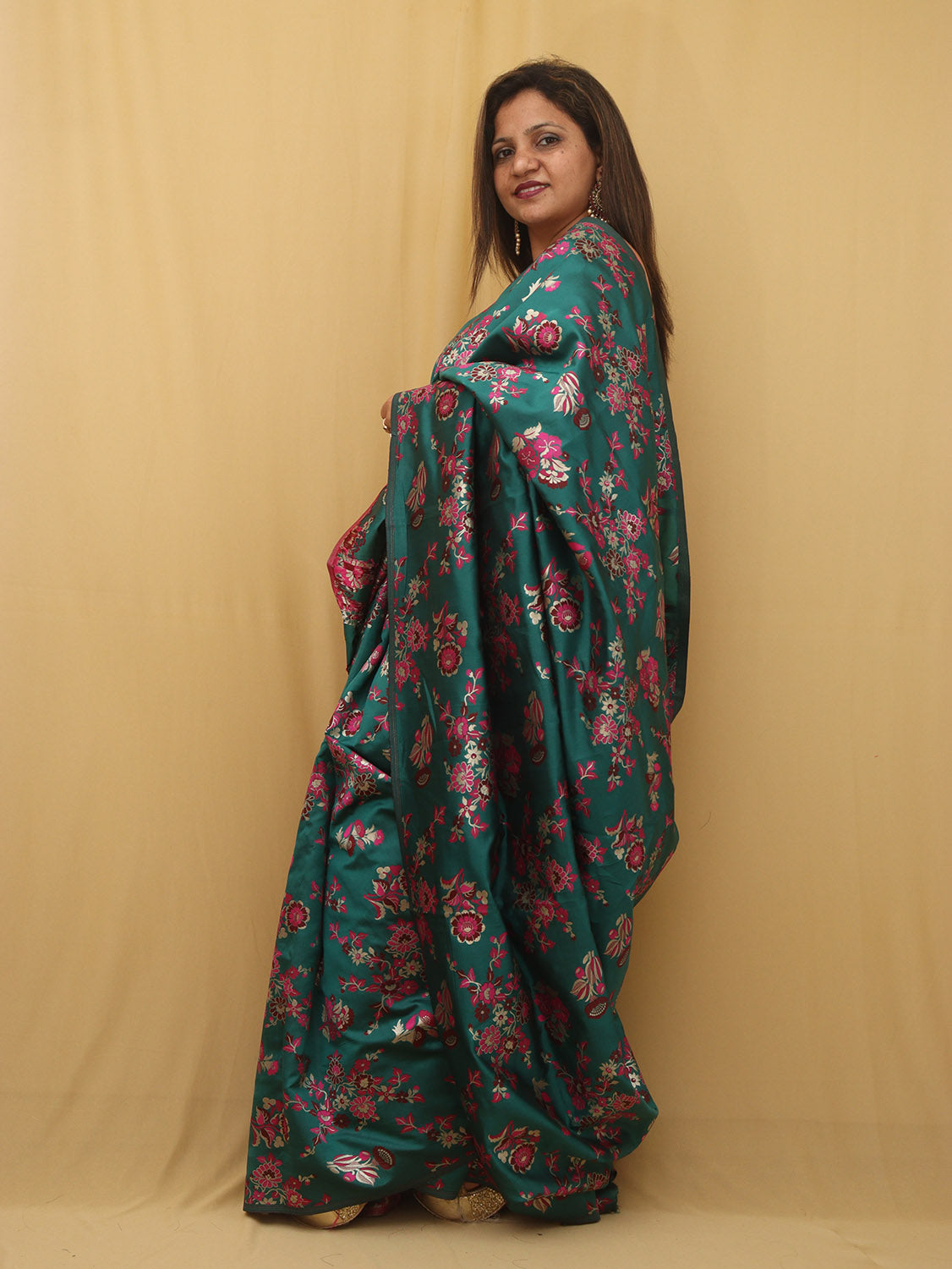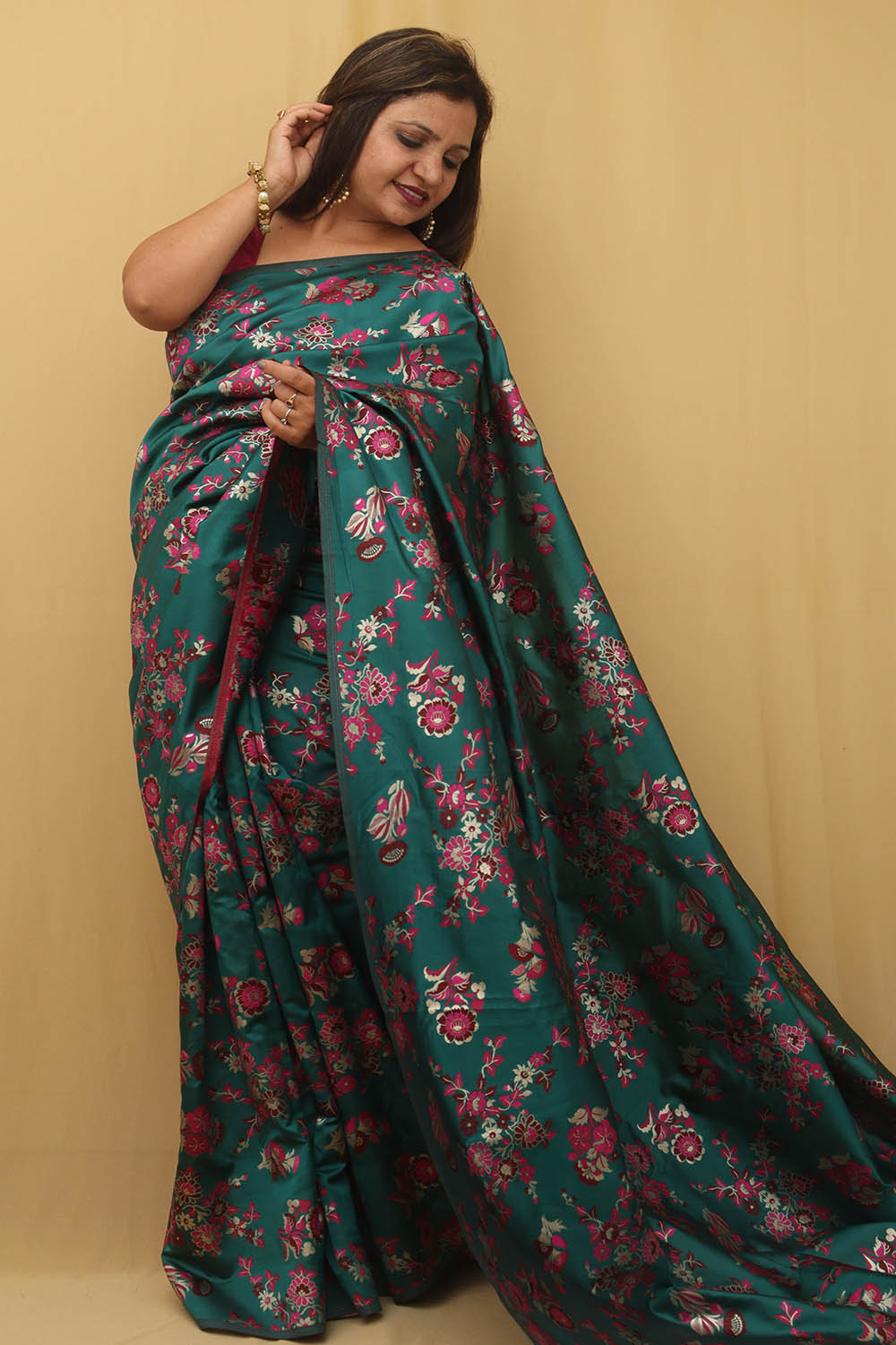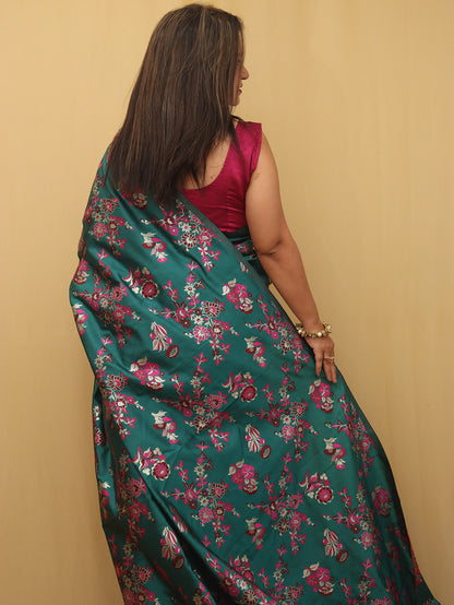 The Green Banarasi Silk Meenakari Saree is a beautiful and elegant piece of clothing that is perfect for any special occasion. Made from high-quality silk, this saree features intricate meenakari work that adds a touch of traditional charm to its overall design. The saree is lightweight and comfortable to wear, making it ideal for long hours of use.