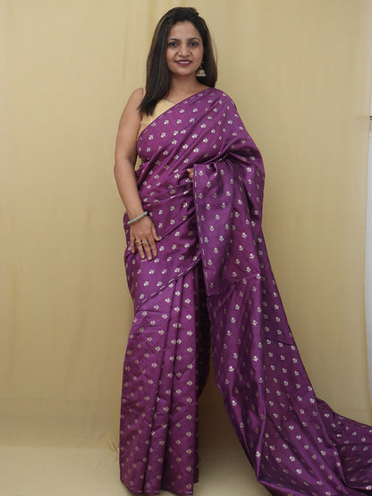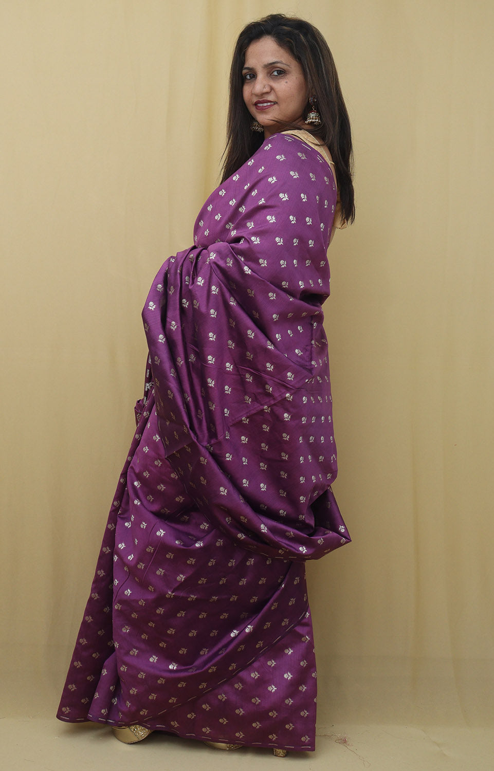 Indulge in the allure of our Exquisite Purple Banarasi Chiniya Silk Saree. Opulent and captivating, this masterpiece is meticulously woven from luxurious Chiniya silk, renowned for its sheen and texture. The deep purple hue exudes regal elegance, while the intricate Banarasi craftsmanship adorns the saree with timeless motifs that shimmer in the light. Be it a wedding, gala, or festive occasion, this saree ensures you stand out with its perfect fusion of tradition and contemporary sophistication. Wrap yourself in the enchantment of heritage and artistry, embodied by the resplendent Purple Banarasi Chiniya Silk Saree.
