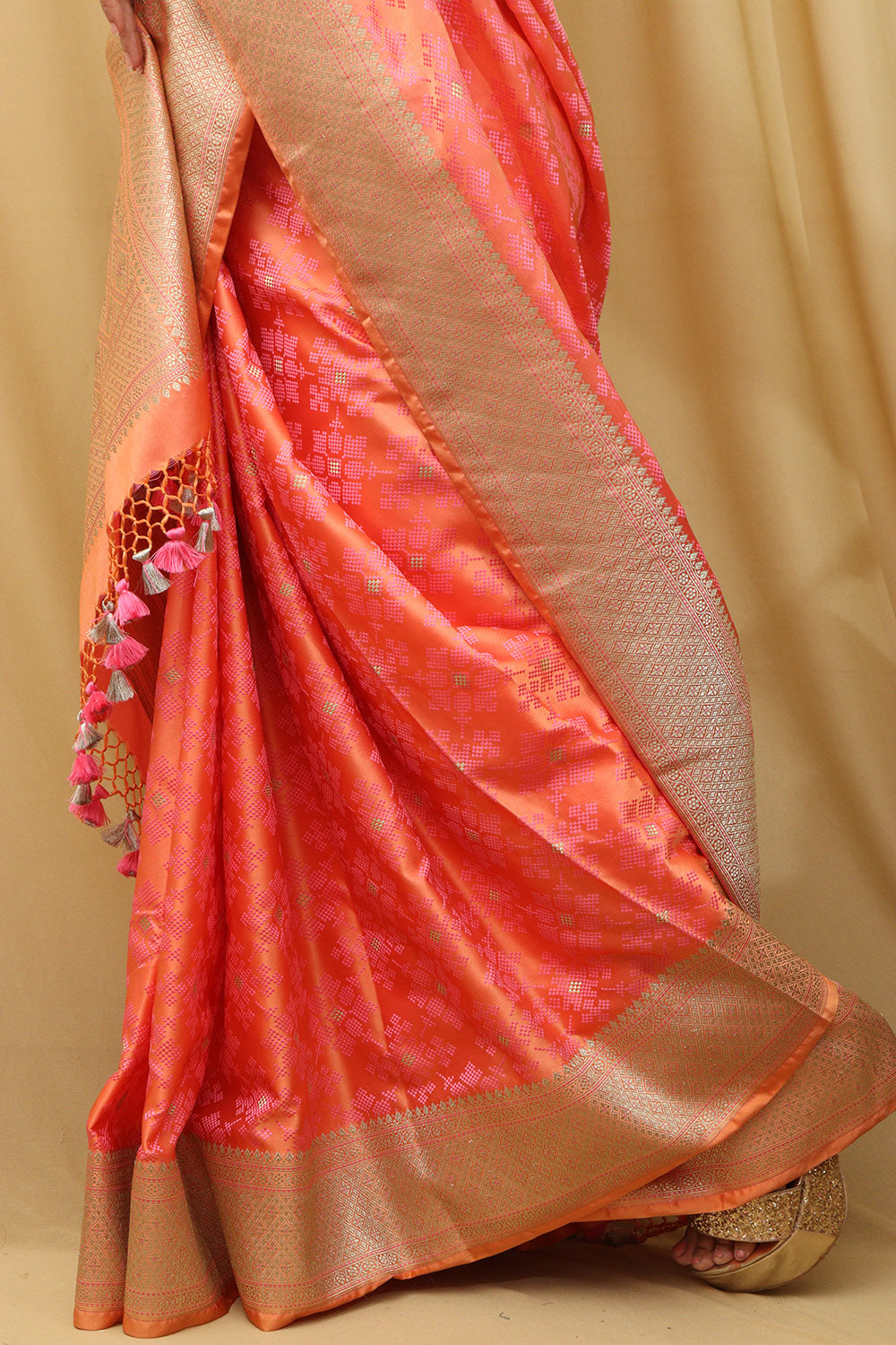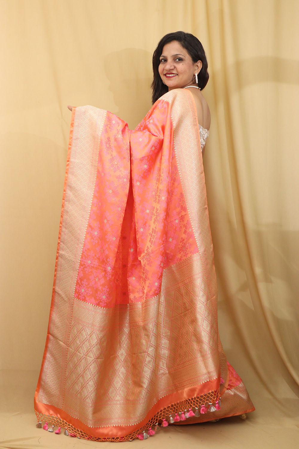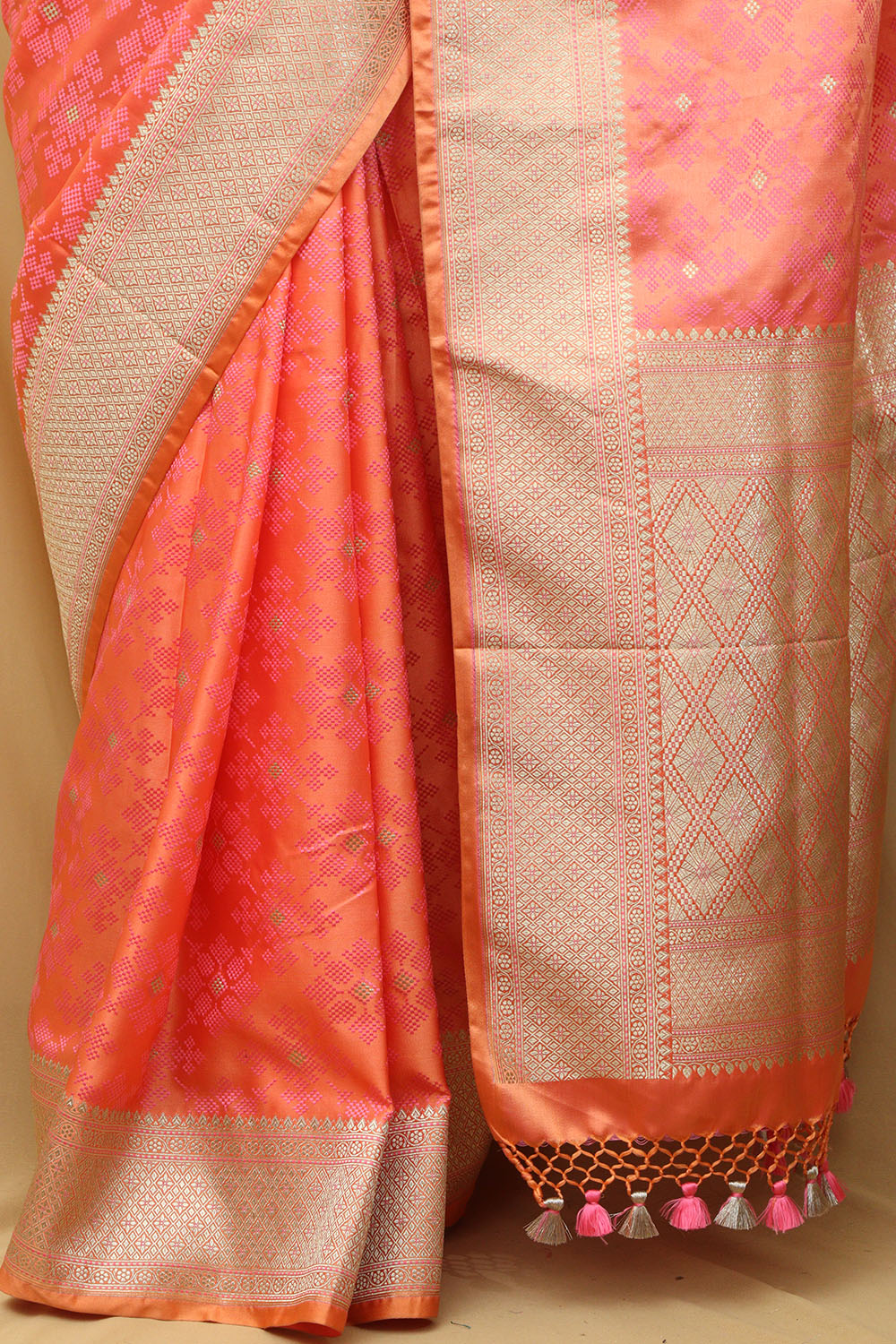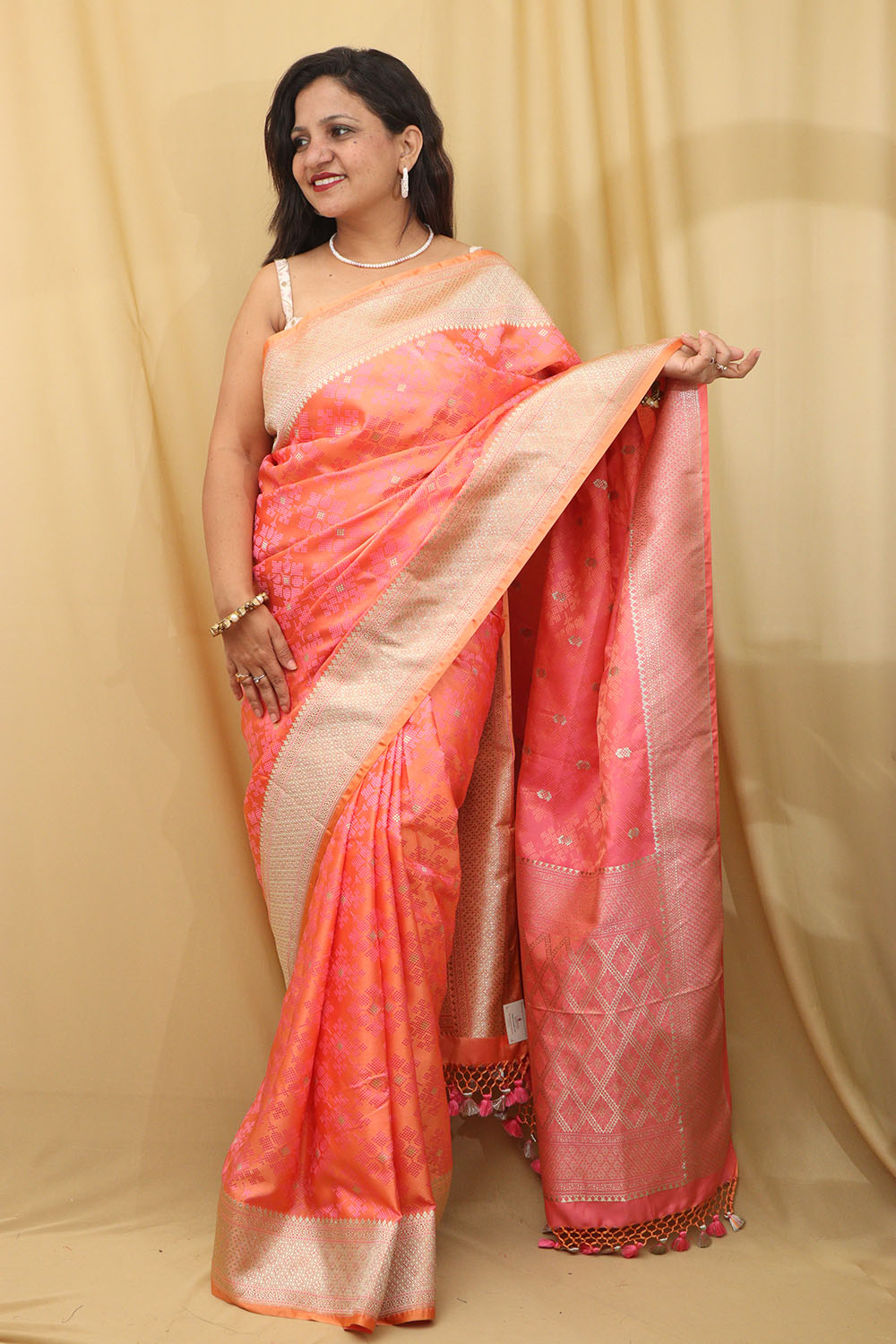 The Orange and Red Shot Banarasi Silk Saree is a stunning piece of traditional Indian attire that exudes elegance and sophistication. Made from luxurious silk fabric, this saree features a beautiful combination of orange and red colors that create a striking shot effect. The intricate Banarasi weaving adds a touch of opulence to the saree, making it perfect for special occasions and festivities. The saree drapes beautifully and is incredibly comfortable to wear. Its rich colors and intricate design make it a timeless piece that will never go out of style.