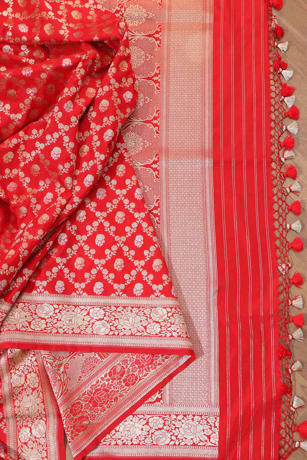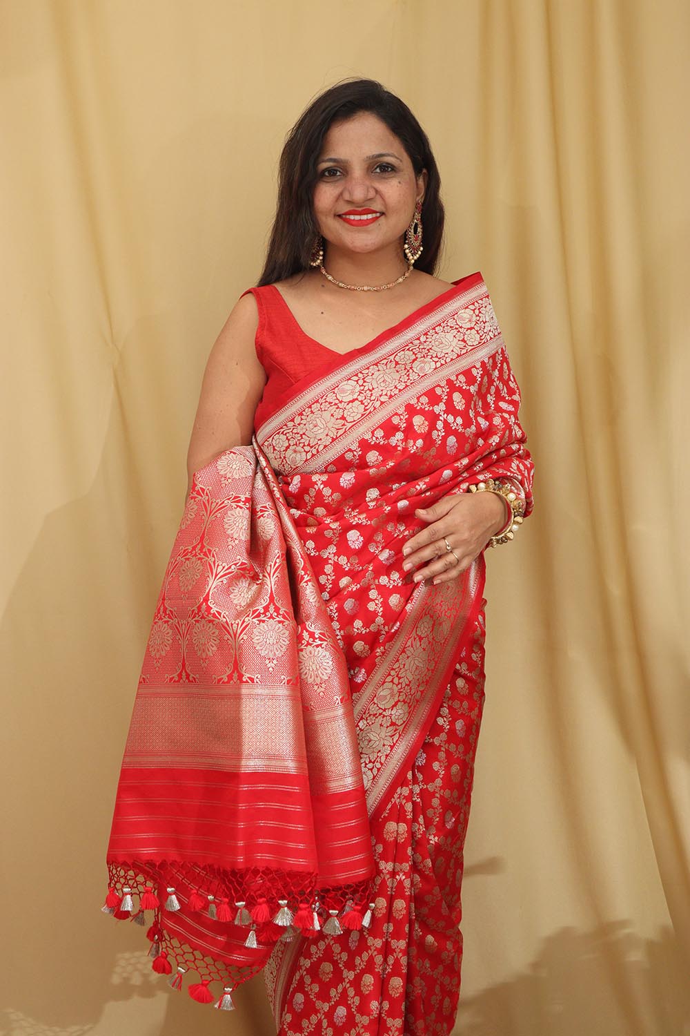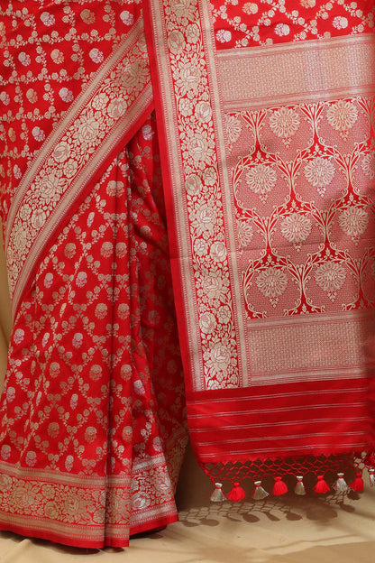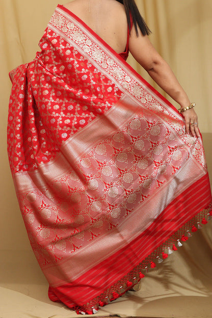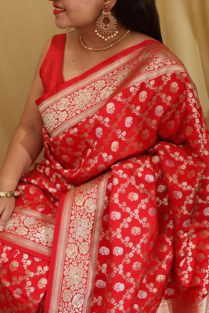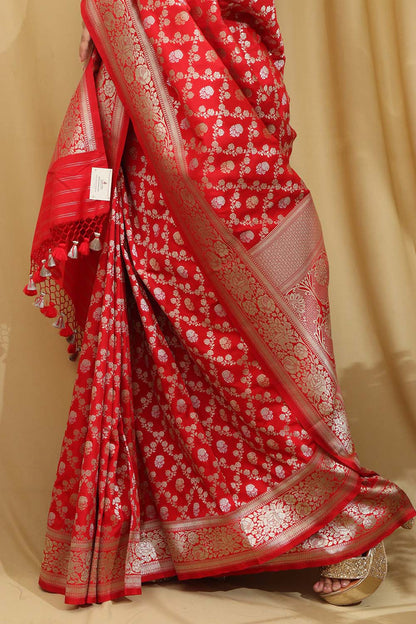 Red Banarasi Silk Saree is a timeless and elegant choice for any special occasion. Made from luxurious silk fabric, this saree features intricate zari work and traditional motifs that add a touch of sophistication to your ensemble. The rich red color of the saree symbolizes passion and vitality, making it a perfect choice for weddings, festivals, and parties. The soft and smooth texture of the silk fabric drapes beautifully, enhancing your silhouette and making you feel like a queen.