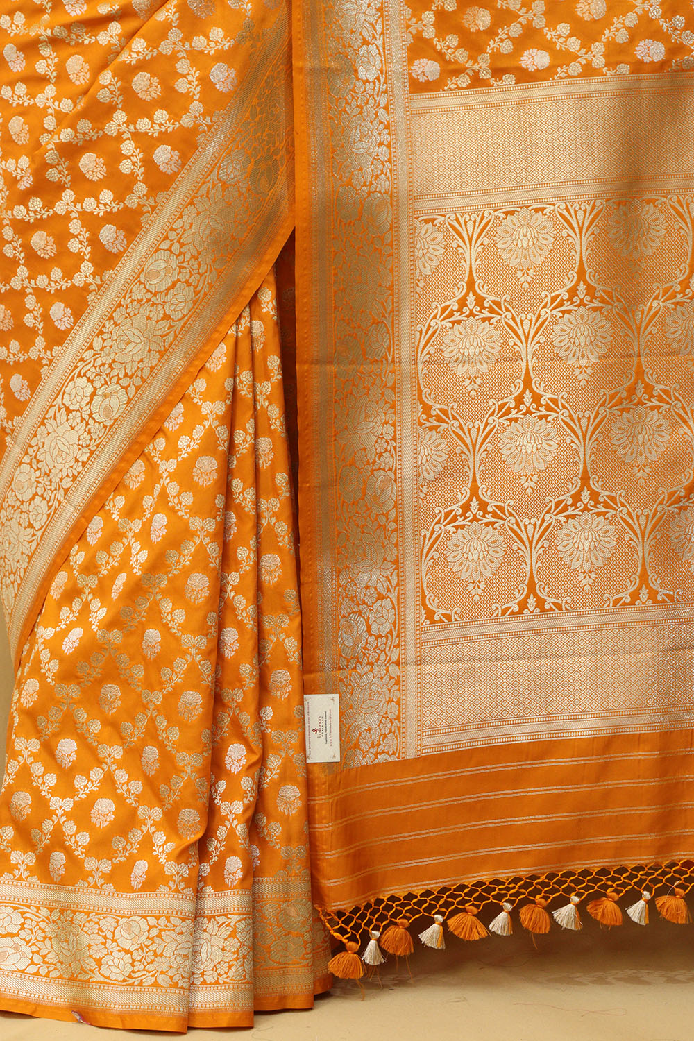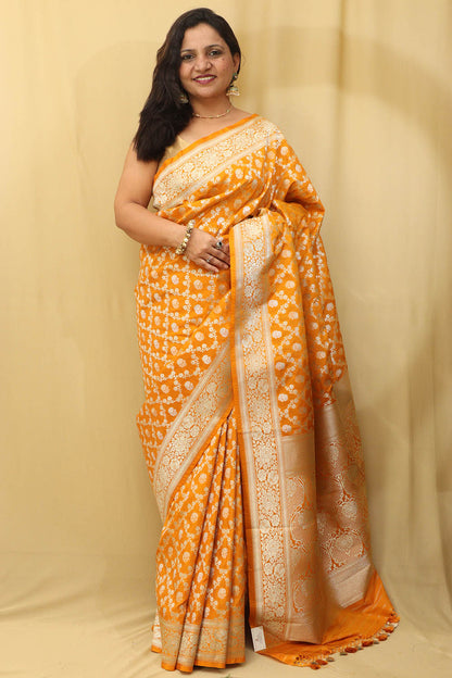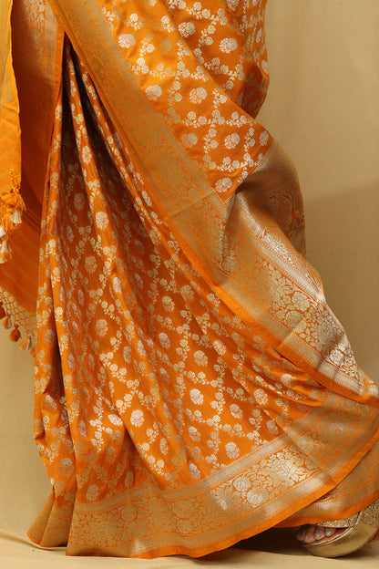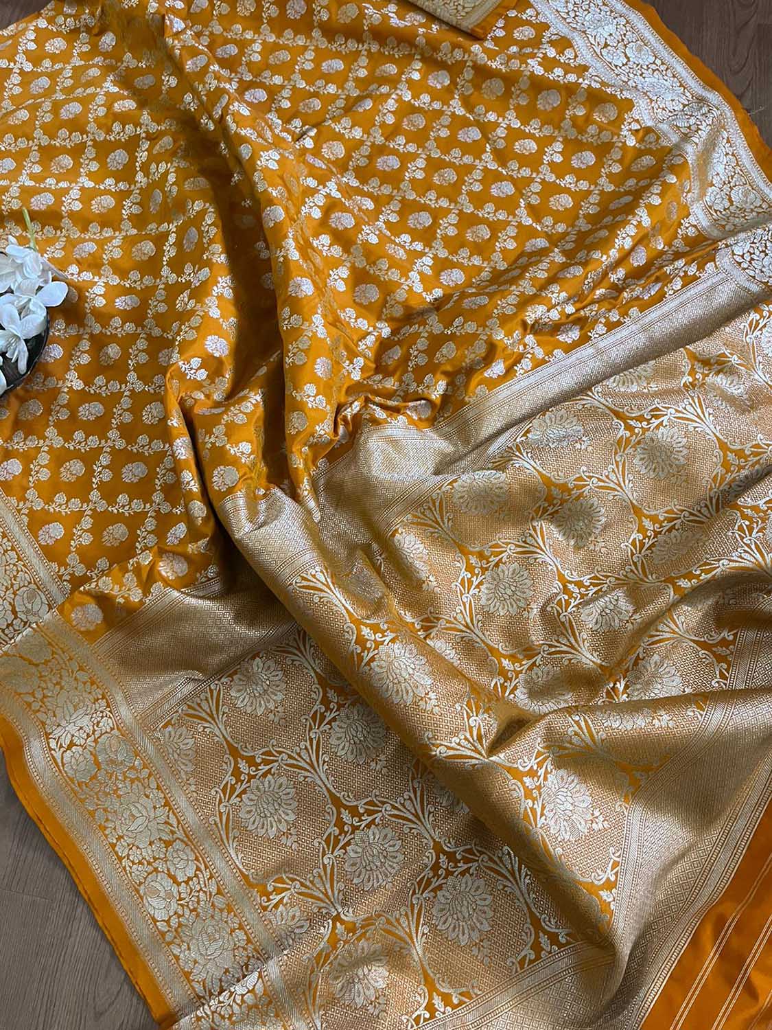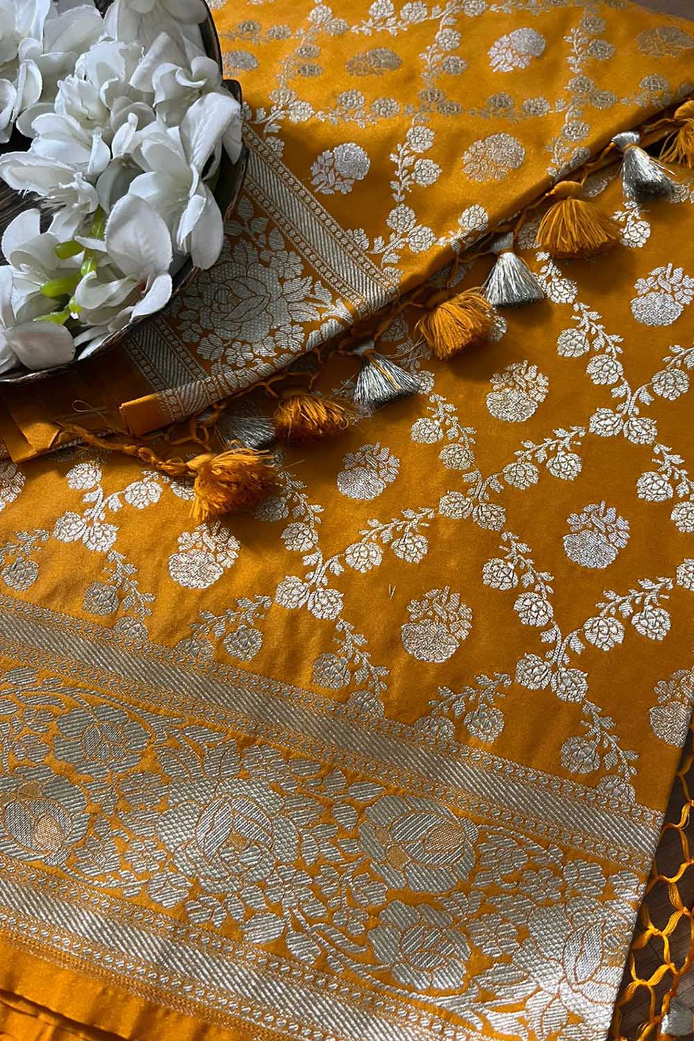 The Yellow Banarasi Silk Saree is a stunning piece of traditional Indian attire that exudes elegance and sophistication. Made from luxurious silk fabric, this saree features intricate golden zari work that adds a touch of glamour to its overall look. The bright yellow color of the saree is perfect for festive occasions and weddings, making it a popular choice among women who want to make a statement. The soft and smooth texture of the silk fabric drapes beautifully around the body, enhancing the wearer's natural grace and beauty.
