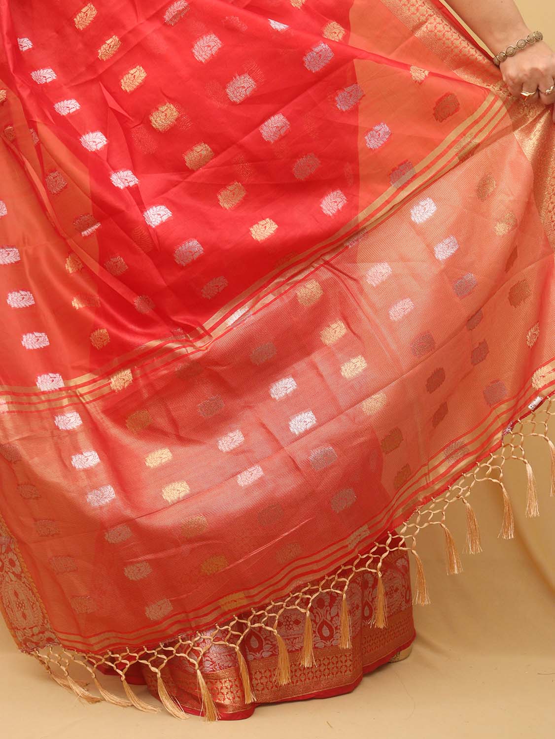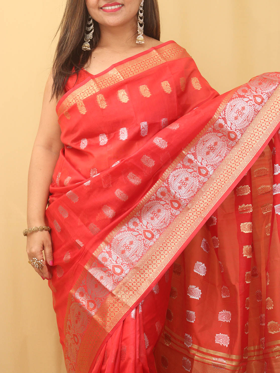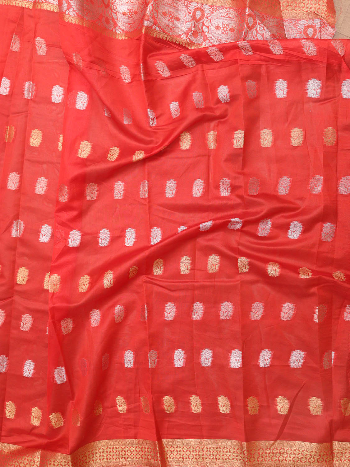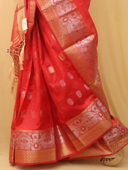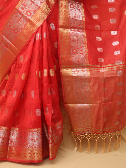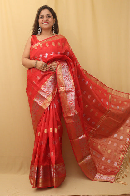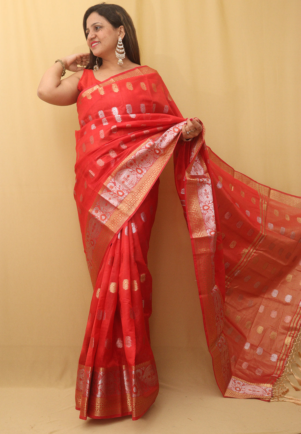 Elegant and luxurious, the Banarasi Cotton Silk Saree seamlessly marries the finesse of Banarasi craftsmanship with the comfort of cotton and the opulence of silk. Delicate threads of gold and silver dance across the fabric, forming intricate motifs inspired by Indian tradition. The saree's lustrous drape exudes timeless charm, making it a versatile choice for both festive occasions and formal gatherings. Its lightweight nature ensures easy movement while the blend of cotton and silk provides a graceful sheen. A masterpiece of artistry, this saree captures the essence of Banaras, India's weaving heritage, in a contemporary fashion.