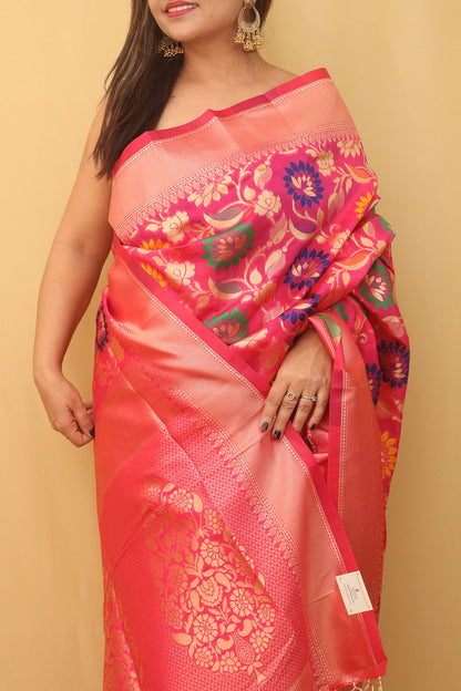Elegant and luxurious, the Banarasi Cotton Silk Saree seamlessly marries the finesse of Banarasi craftsmanship with the comfort of cotton and the opulence of silk. Delicate threads of gold and silver dance across the fabric, forming intricate motifs inspired by Indian tradition. The saree's lustrous drape exudes timeless charm, making it a versatile choice for both festive occasions and formal gatherings. Its lightweight nature ensures easy movement while the blend of cotton and silk provides a graceful sheen. A masterpiece of artistry, this saree captures the essence of Banaras, India's weaving heritage, in a contemporary fashion.