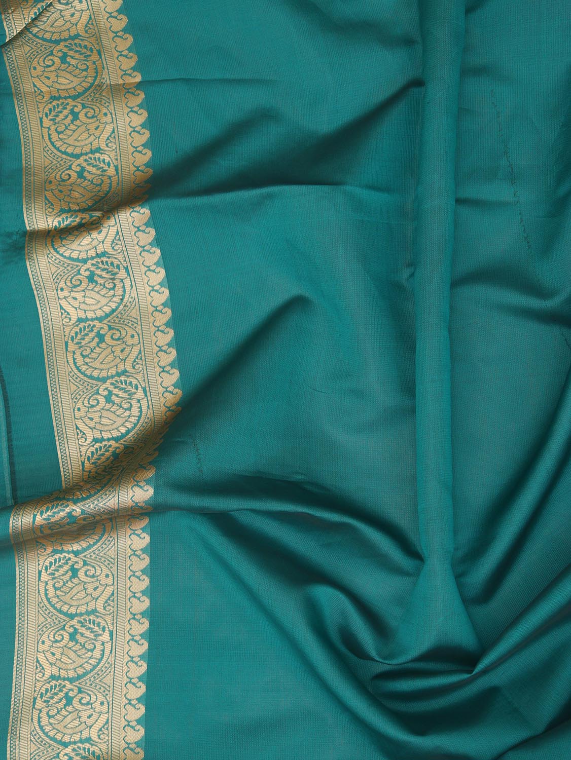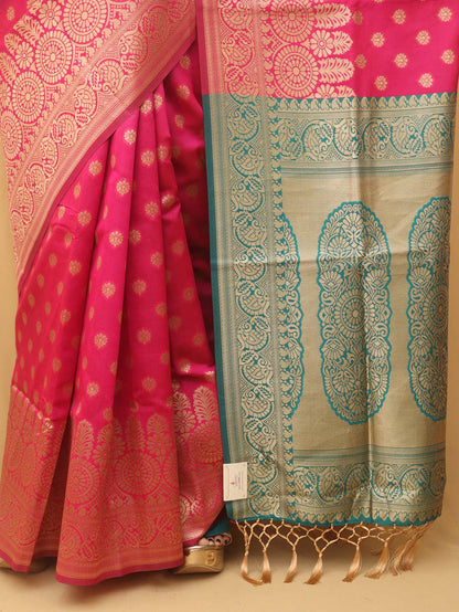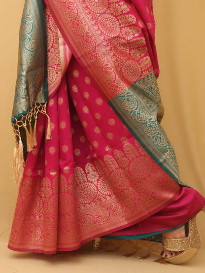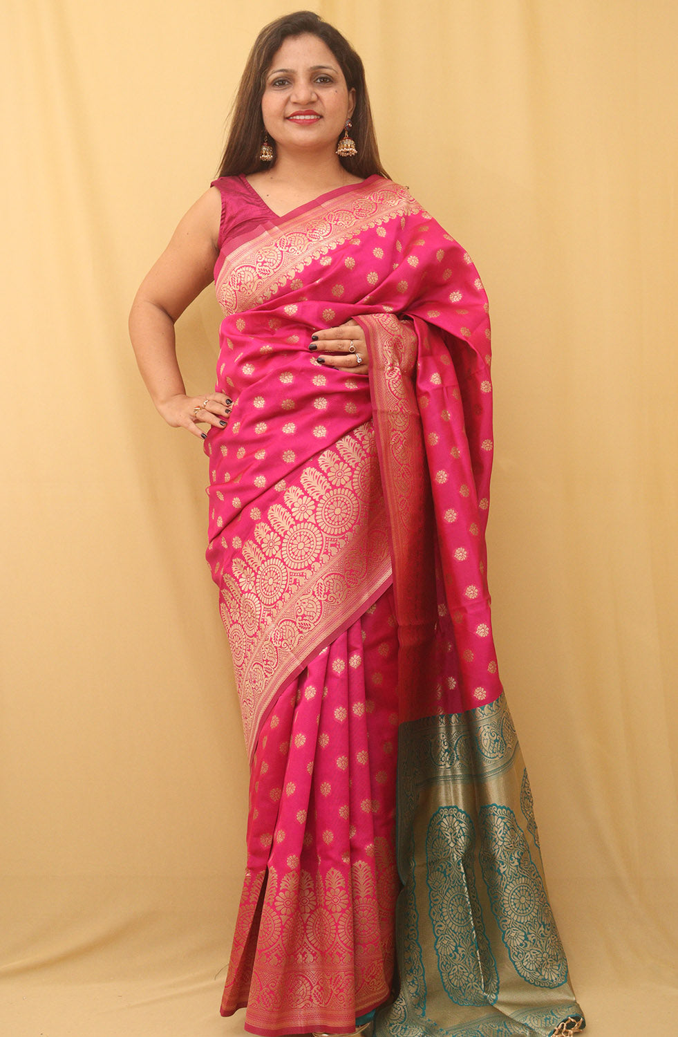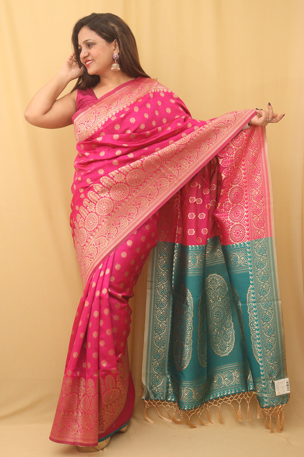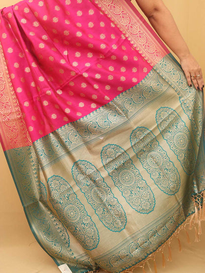 Elegant and luxurious, the Banarasi Cotton Silk Saree seamlessly marries the finesse of Banarasi craftsmanship with the comfort of cotton and the opulence of silk. Delicate threads of gold and silver dance across the fabric, forming intricate motifs inspired by Indian tradition. The saree's lustrous drape exudes timeless charm, making it a versatile choice for both festive occasions and formal gatherings. Its lightweight nature ensures easy movement while the blend of cotton and silk provides a graceful sheen. A masterpiece of artistry, this saree captures the essence of Banaras, India's weaving heritage, in a contemporary fashion.