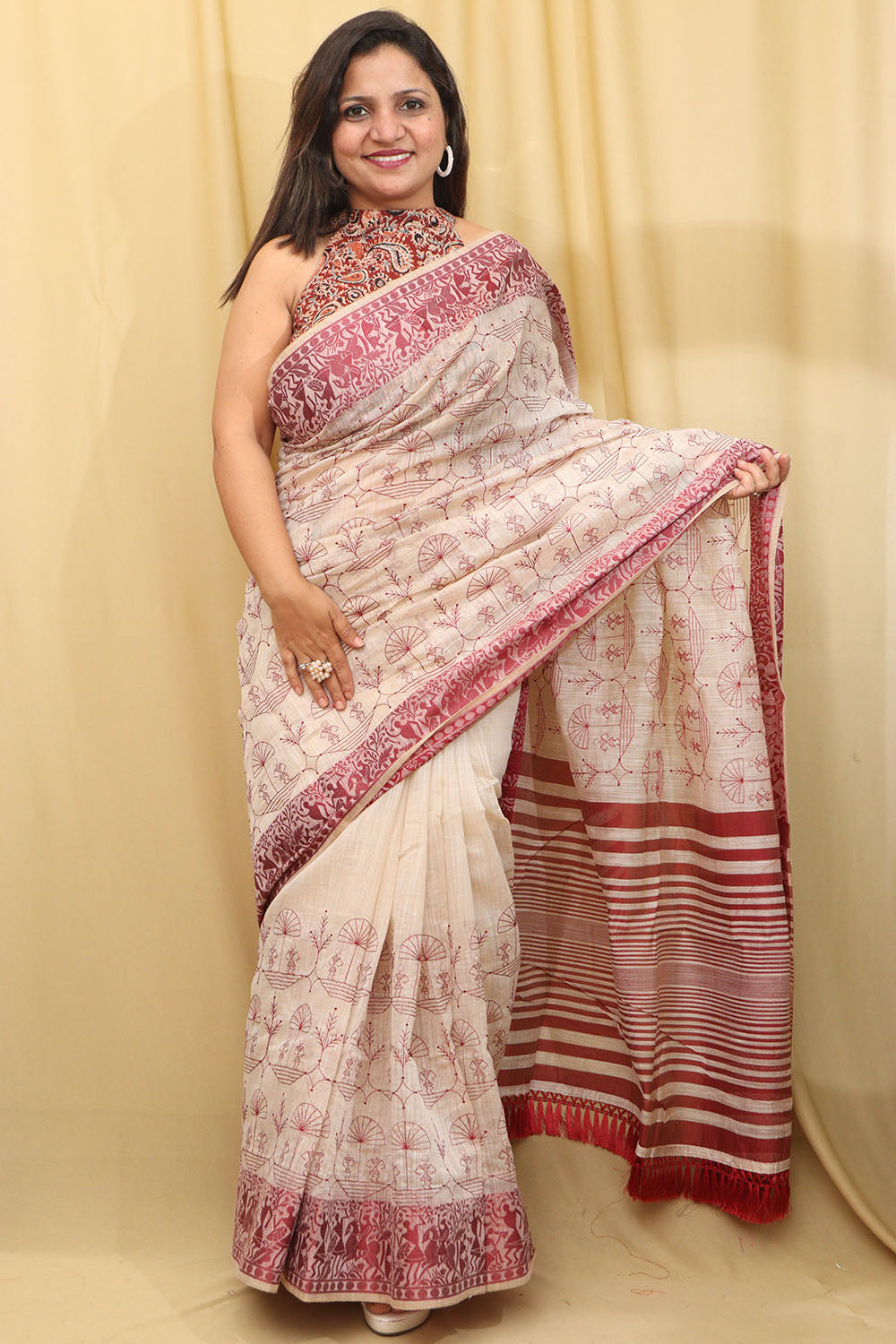 The Pastel Embroidered Bhagalpur Tussar Silk Saree is a stunning piece of traditional Indian attire that exudes elegance and sophistication. Made from luxurious Tussar silk, this saree features intricate embroidery in pastel shades that add a touch of femininity and grace. The lightweight fabric drapes beautifully, making it perfect for special occasions and festive events. The saree comes with a matching blouse piece that can be tailored to your measurements.