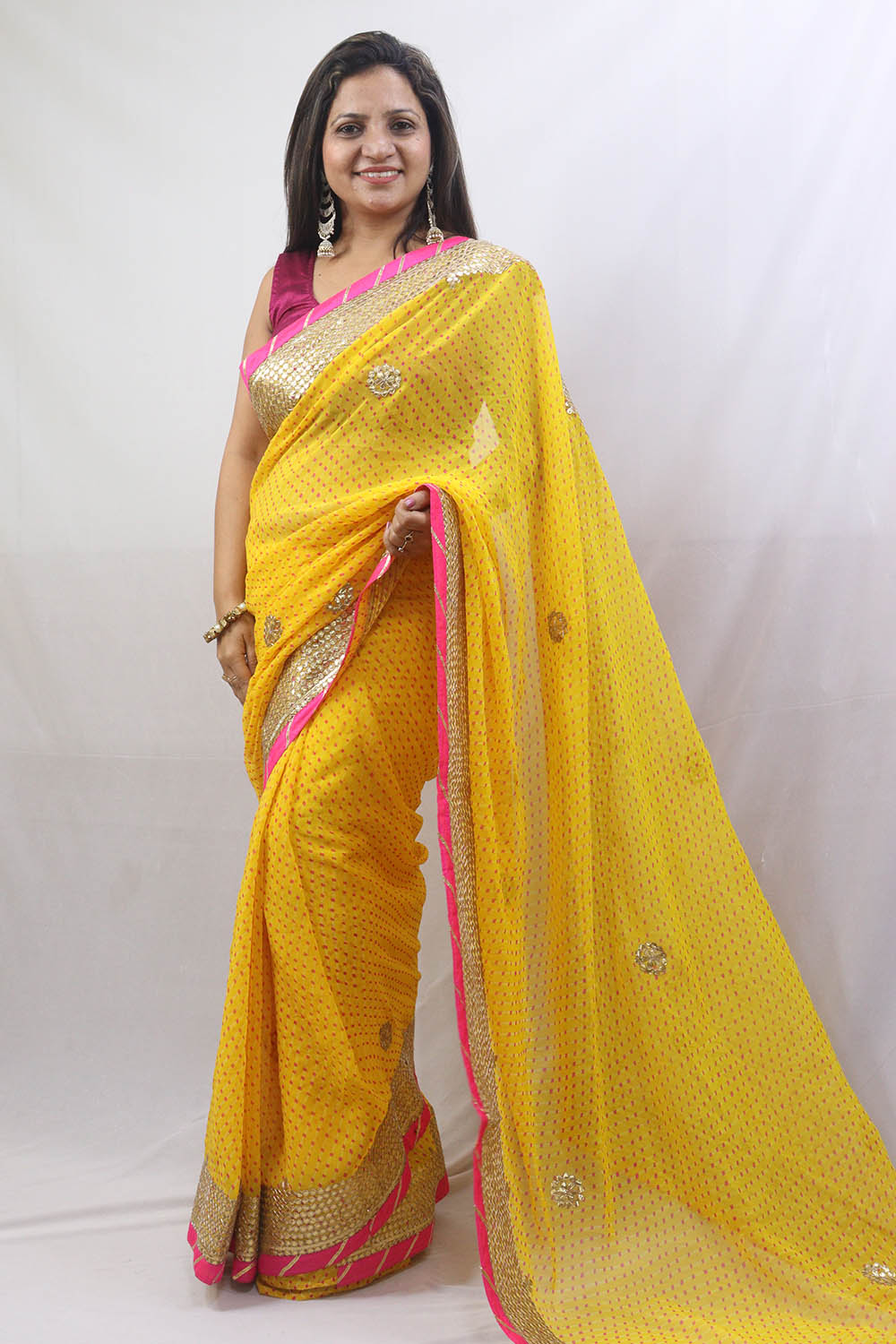 Overall, the Yellow Gota Patti Georgette Saree is a must-have for anyone who loves traditional Indian clothing. With its high-quality fabric, intricate embroidery, and vibrant color, this saree is sure to become a staple in your wardrobe for years to come.