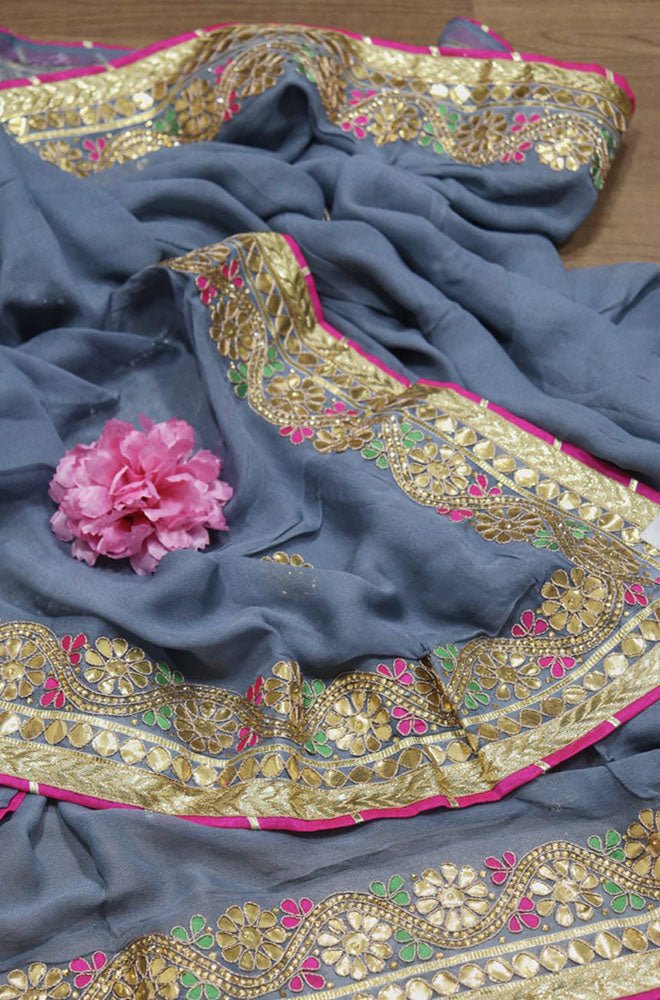 The Grey Gota Patti Georgette Saree is a stunning piece of ethnic wear that is perfect for any occasion. Made from high-quality georgette fabric, this saree features intricate gota patti work that adds a touch of elegance and sophistication to the overall look. The grey color of the saree is versatile and can be paired with a variety of different accessories to create a unique and personalized look.
