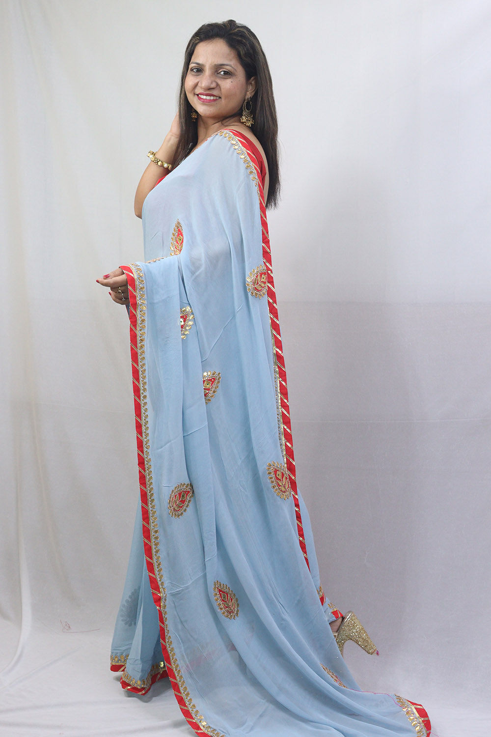 Whether you're attending a wedding, a formal event, or simply want to add a touch of traditional Indian style to your wardrobe, the Grey Gota Patti Georgette Saree is the perfect choice. With its high-quality fabric, intricate design, and versatile color, this saree is sure to become a staple in your collection for years to come.