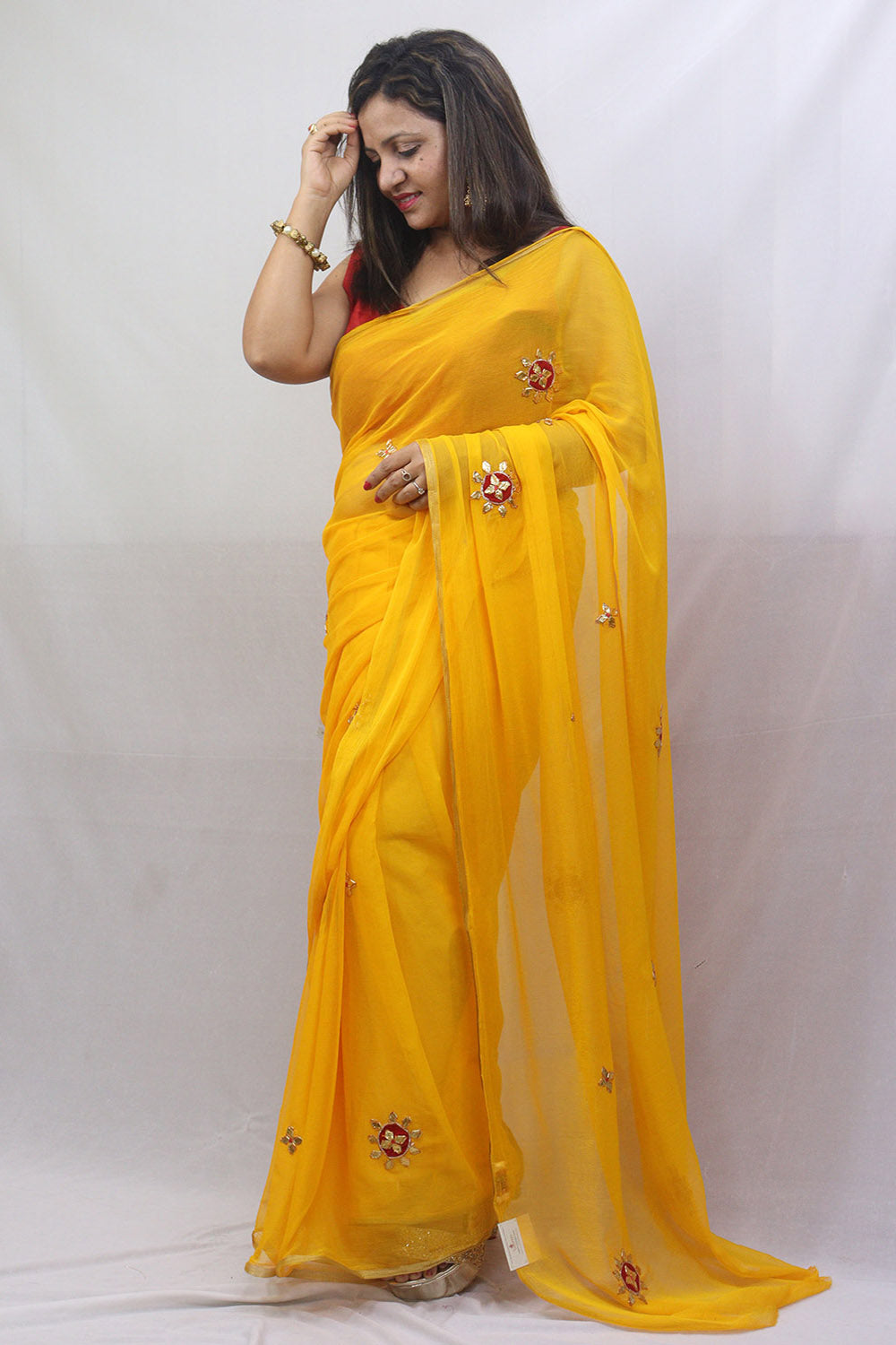 Overall, the Yellow Gota Patti Georgette Saree is a must-have for anyone who loves traditional Indian attire. With its stunning design, high-quality fabric, and comfortable fit, it's sure to become a favorite in your wardrobe. So why wait? Order yours today and get ready to turn heads wherever you go!
