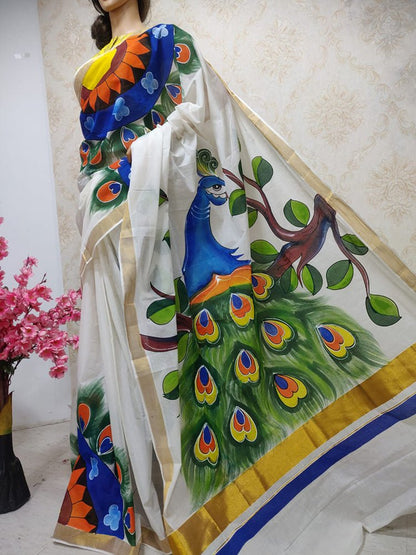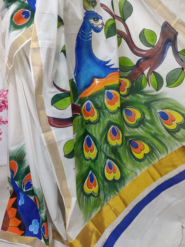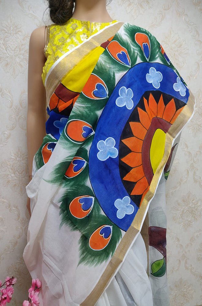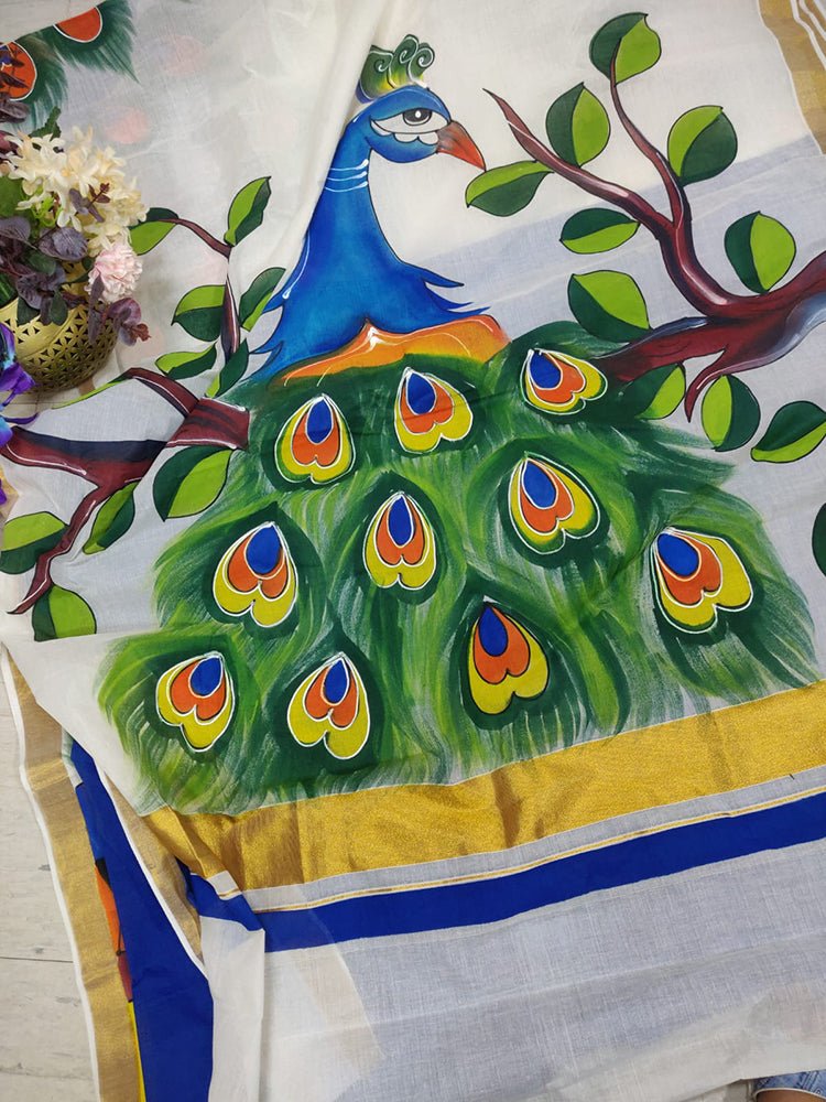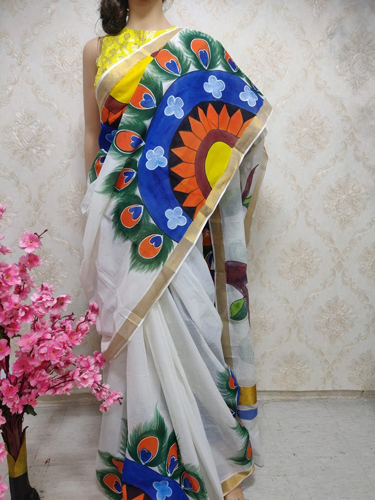 Are you looking for a comfortable wear yet traditional classic Saree. Than you cant give a miss to our Hand Painted Kerela Cotton Saree. The patterns on the saree makes it really beautiful and add grace to your entire look. The love story of a woman and her sarees is a tale told and retold several times. The elegance and uniqueness of a saree is what makes it different from other garments. This pushes the designers to experiment with innovative ideas to come up with yet another version of a saree. The latest in league is the splendour of a painter’s touch to the beauty of the nine yard wonder – the hand painted saree.
