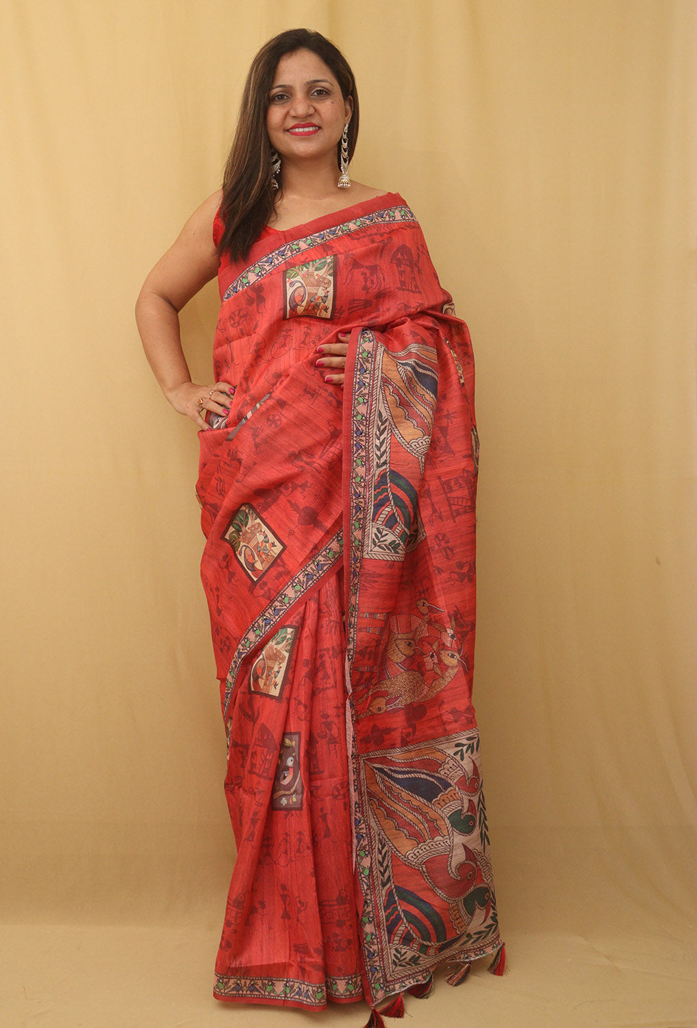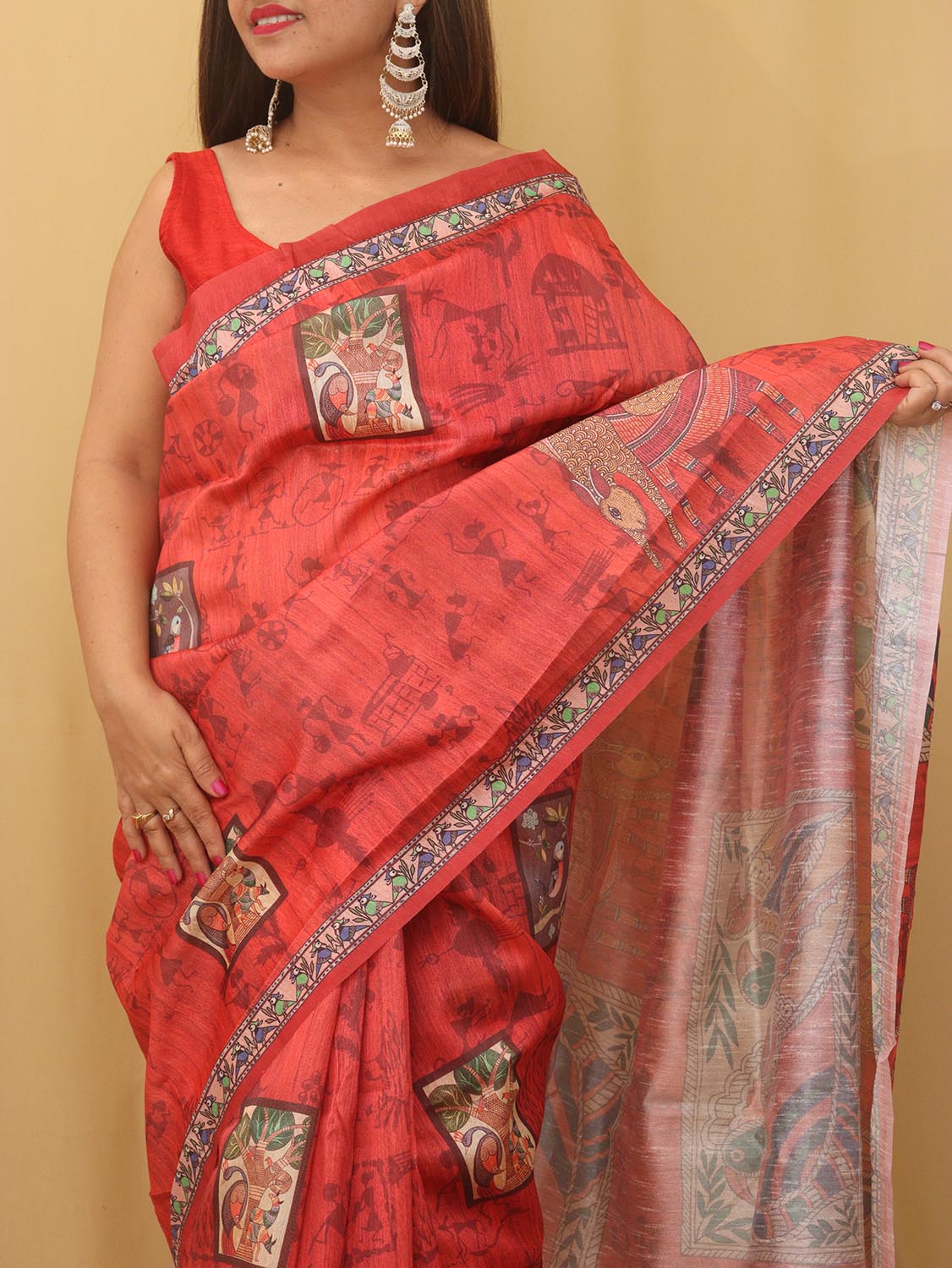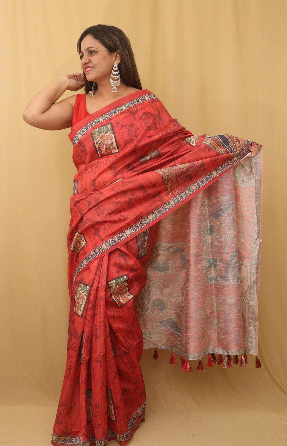 The Kalamkari Print Semi Tussar Silk Saree is a masterpiece of artistic finesse and opulent charm. Woven from semi Tussar silk, it showcases intricate Kalamkari print designs, featuring traditional Indian motifs and stories that come to life on the fabric. The semi Tussar silk adds a touch of luxury with its rich texture and graceful drape, ensuring both comfort and elegance. This saree effortlessly marries heritage and contemporary style, making it suitable for a myriad of occasions. With its captivating patterns and sumptuous silk fabric, it's a versatile and timeless addition to any wardrobe, embodying cultural richness and artisanal craftsmanship with a modern twist.