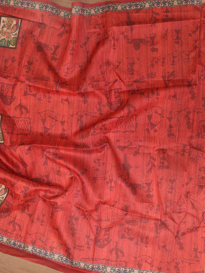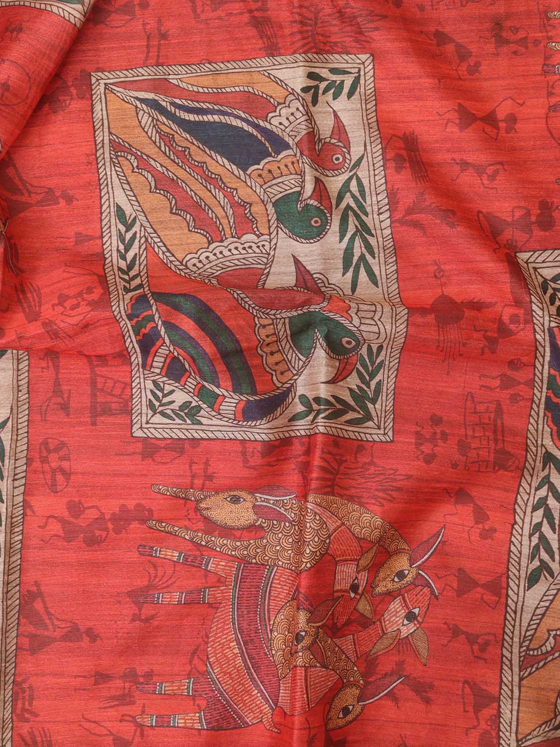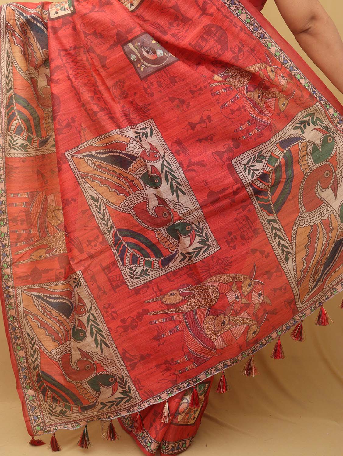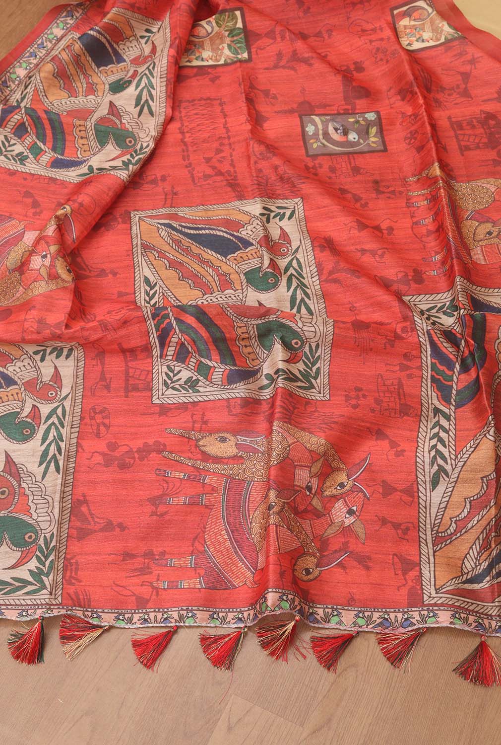 The Kalamkari Print Semi Tussar Silk Saree is a masterpiece of artistic finesse and opulent charm. Woven from semi Tussar silk, it showcases intricate Kalamkari print designs, featuring traditional Indian motifs and stories that come to life on the fabric. The semi Tussar silk adds a touch of luxury with its rich texture and graceful drape, ensuring both comfort and elegance. This saree effortlessly marries heritage and contemporary style, making it suitable for a myriad of occasions. With its captivating patterns and sumptuous silk fabric, it's a versatile and timeless addition to any wardrobe, embodying cultural richness and artisanal craftsmanship with a modern twist.