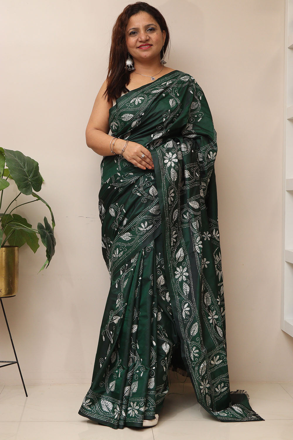 The Green Hand Embroidered Kantha Silk Saree is a stunning piece of traditional Indian craftsmanship. This saree features intricate hand embroidery in vibrant green thread, creating a beautiful floral pattern that adds a touch of elegance to any outfit. Made from luxurious silk fabric, this saree drapes beautifully and feels soft against the skin. The rich green color is perfect for special occasions or festive events. The Kantha stitching adds a unique texture to the saree, making it stand out from the crowd. This saree is a timeless piece that will never go out of style.