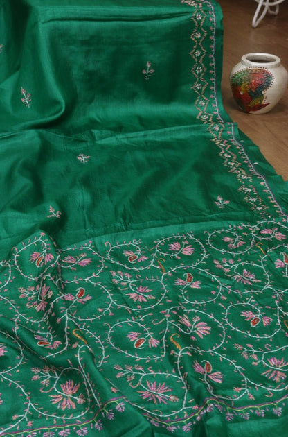 The Green Embroidered Sozni Work Kashmiri Pure Silk Saree is a stunning piece of traditional Indian clothing that is perfect for any special occasion. Made from pure silk, this saree is soft, lightweight, and comfortable to wear. The intricate embroidery work on the saree is done using the Sozni technique, which is a traditional embroidery style from the Kashmir region of India. The saree features beautiful floral and paisley designs in shades of green, gold, and white, which add to its overall elegance and charm.