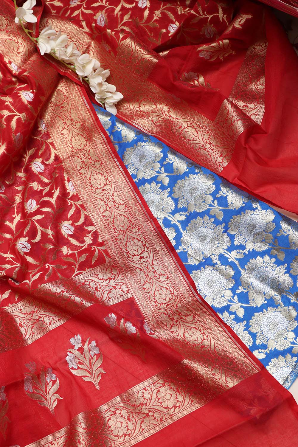 Elegance and sophistication come together in this stunning Blue Banarasi Silk Suit with Red Banarasi Cotton Silk Dupatta. The rich blue color of the suit is complemented perfectly by the intricate Banarasi silk work, adding a touch of luxury to your ensemble. The red dupatta adds a pop of color and contrast, making this outfit perfect for any special occasion. The high-quality fabric ensures comfort and durability, while the traditional design adds a timeless appeal. Stand out from the crowd in this exquisite outfit and make a statement wherever you go.