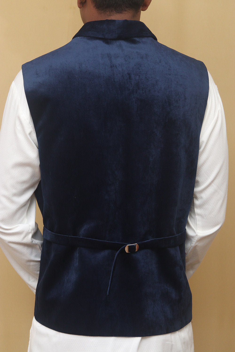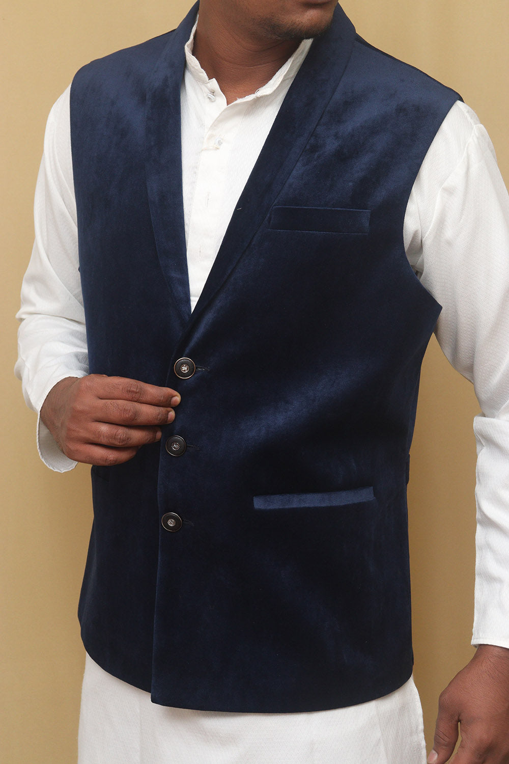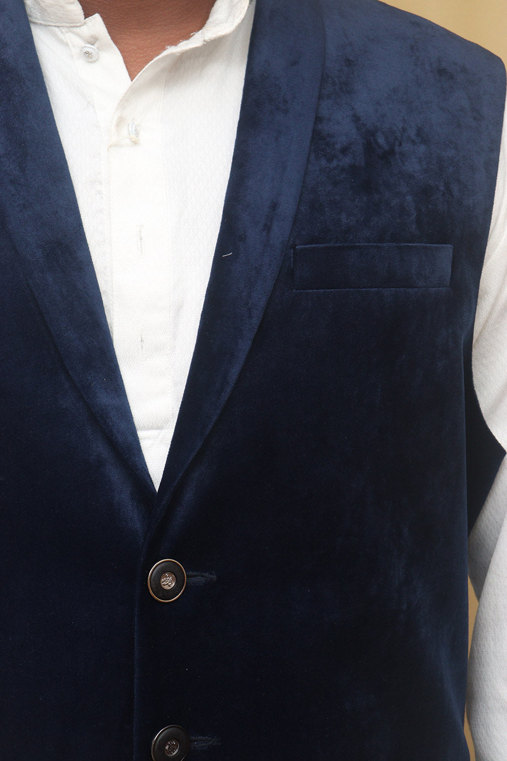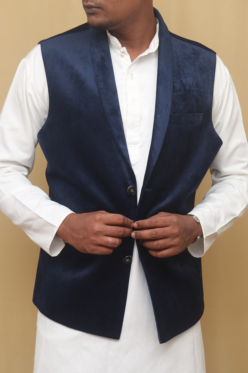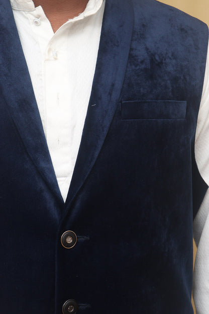 The Navy Blue Cotton Velvet Waist Coat is a stylish and versatile piece that can elevate any outfit. Made from high-quality cotton velvet, it offers a luxurious and soft feel against the skin. The navy blue color adds a touch of sophistication and can easily be paired with a variety of shirts and trousers. The waist coat features a classic design with a button-up front and a V-neckline. It also has two front pockets, perfect for storing small essentials. The special features of this waist coat include its comfortable fit, durable construction, and easy maintenance. It is also lightweight, making it suitable for both casual and formal occasions. Additionally, it is available in various sizes, ensuring a perfect fit for everyone.