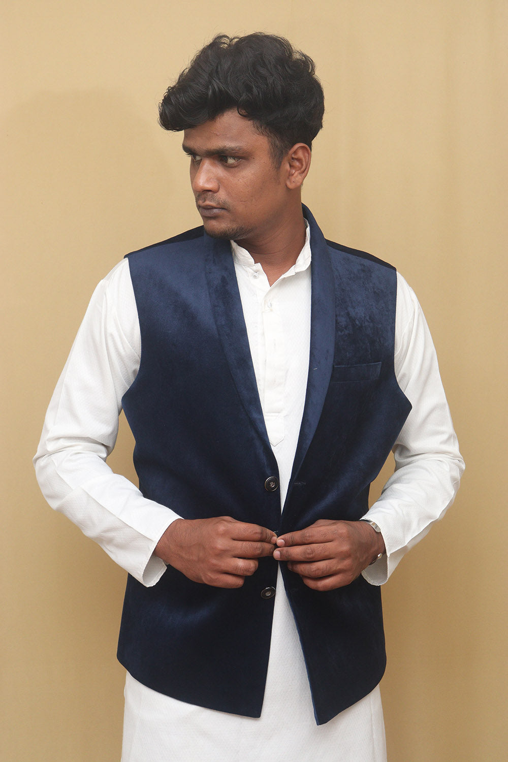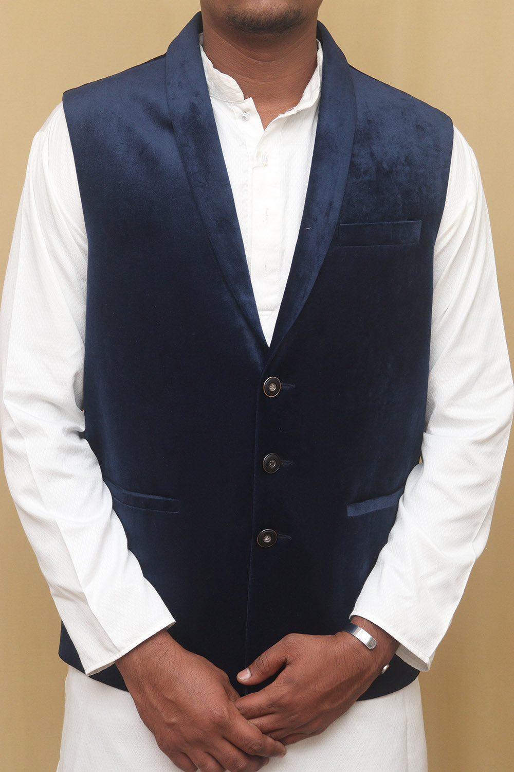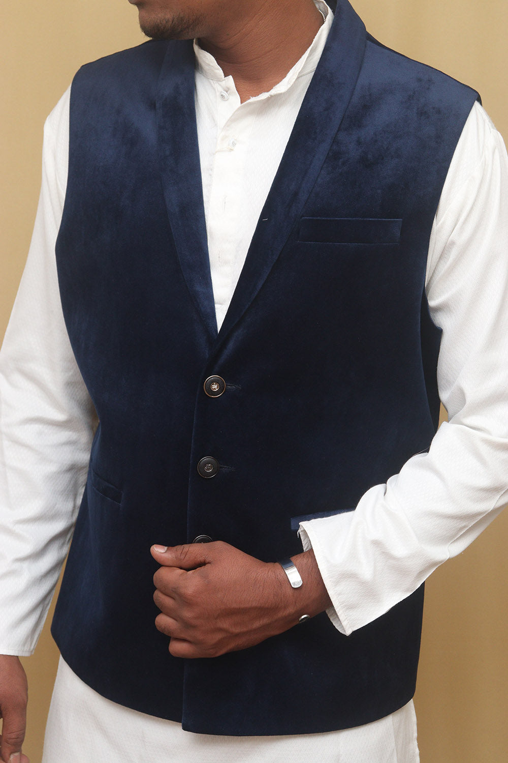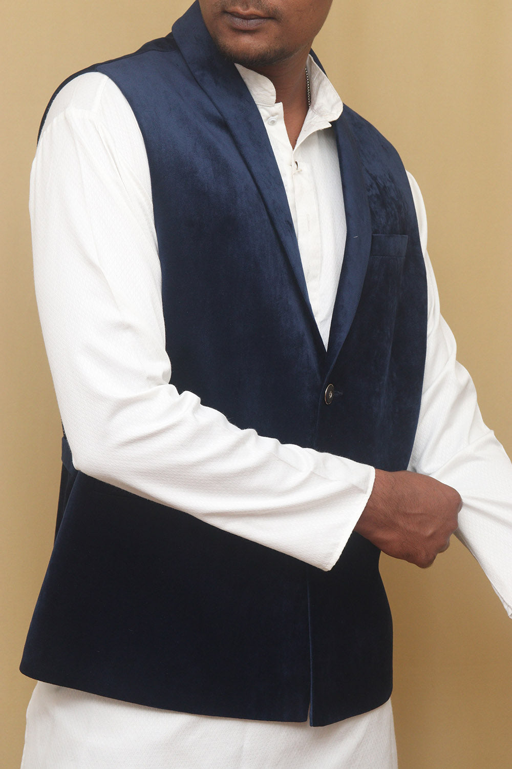 The Navy Blue Cotton Velvet Waist Coat is a stylish and versatile piece that can elevate any outfit. Made from high-quality cotton velvet, it offers a luxurious and soft feel against the skin. The navy blue color adds a touch of sophistication and can easily be paired with a variety of shirts and trousers. The waist coat features a classic design with a button-up front and a V-neckline. It also has two front pockets, perfect for storing small essentials. The special features of this waist coat include its comfortable fit, durable construction, and easy maintenance. It is also lightweight, making it suitable for both casual and formal occasions. Additionally, it is available in various sizes, ensuring a perfect fit for everyone.