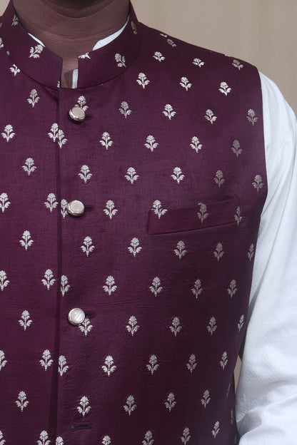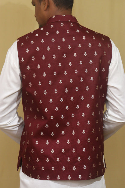 The Maroon Banarasi Silk Jacket is a stunning piece of clothing that exudes elegance and sophistication. Made from high-quality Banarasi silk, this jacket features a rich maroon color that adds a touch of luxury to any outfit. The intricate Banarasi weaving on the jacket adds a traditional and ethnic charm, making it perfect for special occasions and festivities. The jacket is designed with a mandarin collar and full sleeves, providing a comfortable and stylish fit. It can be paired with both ethnic and western wear, making it a versatile addition to your wardrobe. The jacket is available in various sizes, ensuring a perfect fit for everyone.