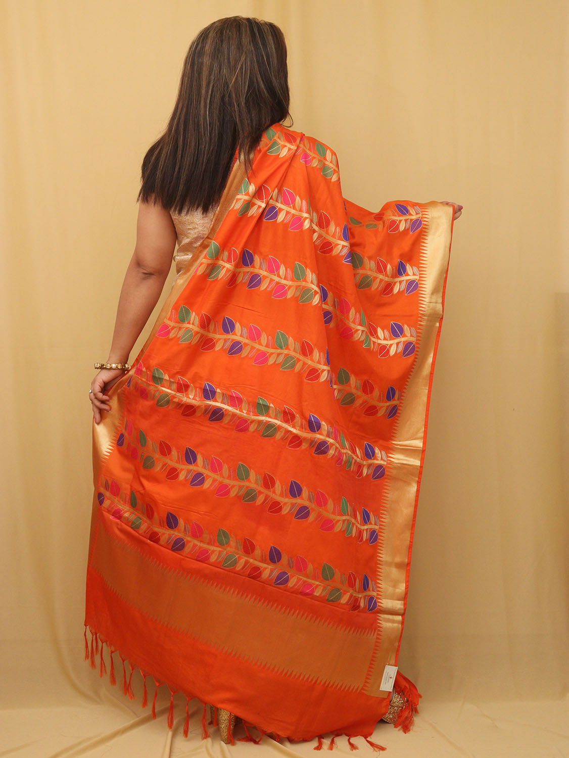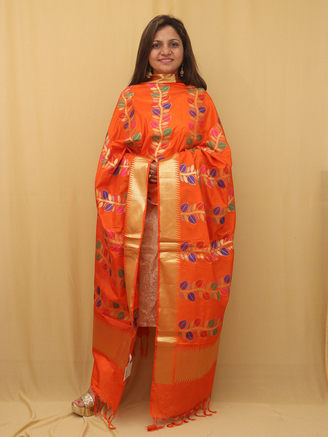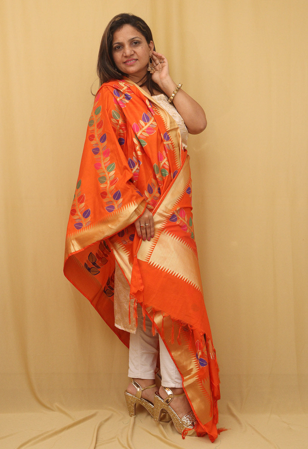 This dupatta is made from high-quality Banarasi silk fabric, which is known for its durability and luxurious feel. The Meenakari work is done by skilled artisans, making each piece unique and special. The bright orange color is perfect for any festive occasion, and can be paired with a variety of outfits. Whether you're wearing a traditional Indian outfit or a modern western outfit, this dupatta is sure to add a touch of elegance and sophistication to your look.
