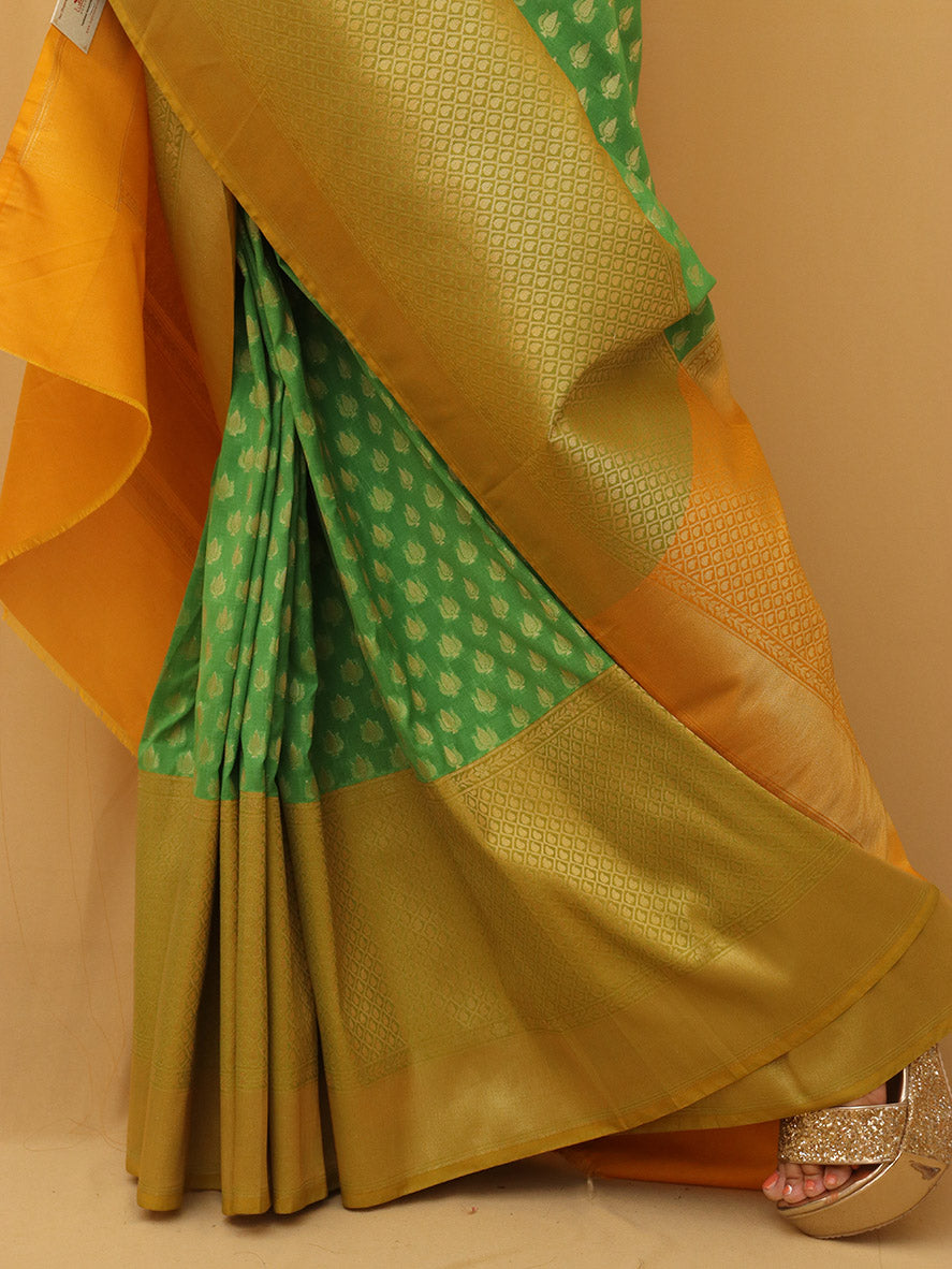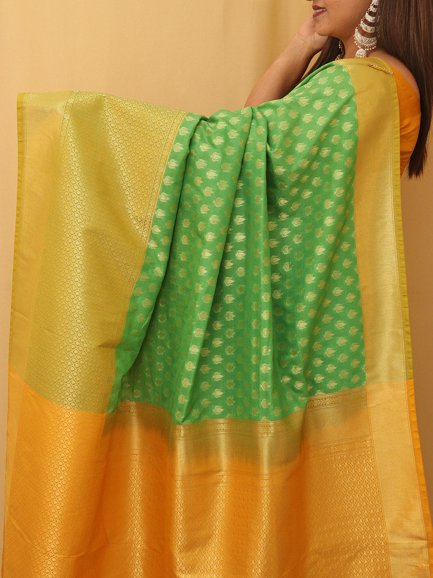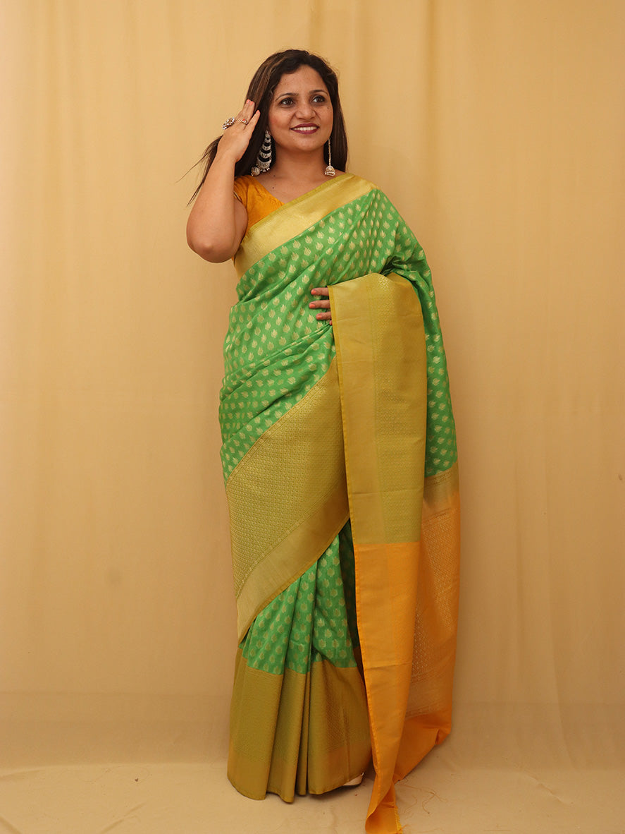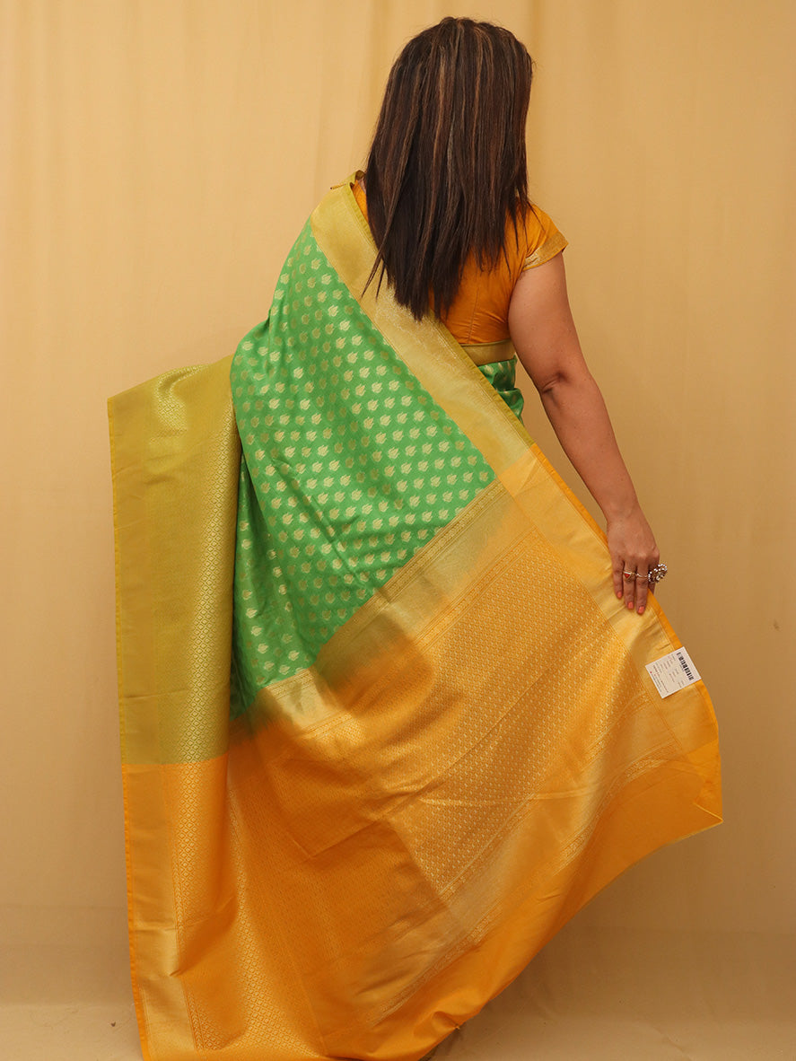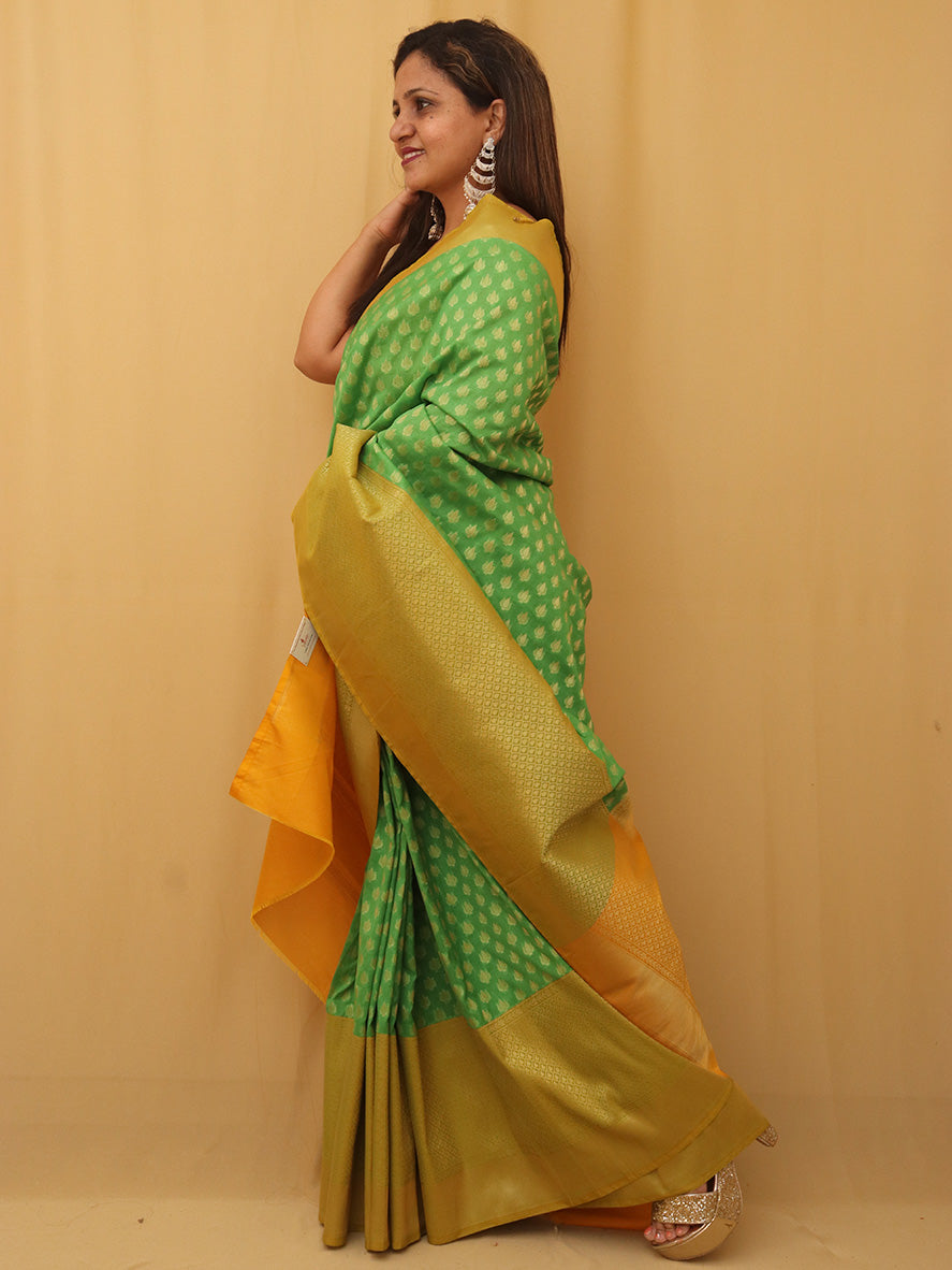 Shop exquisite Green Handloom Banarasi Silk Sarees online now! Our collection of Banarasi silk sarees is handcrafted by skilled artisans in Varanasi, India. Each saree is a masterpiece of intricate weaving and exquisite design, making it a perfect addition to your wardrobe.