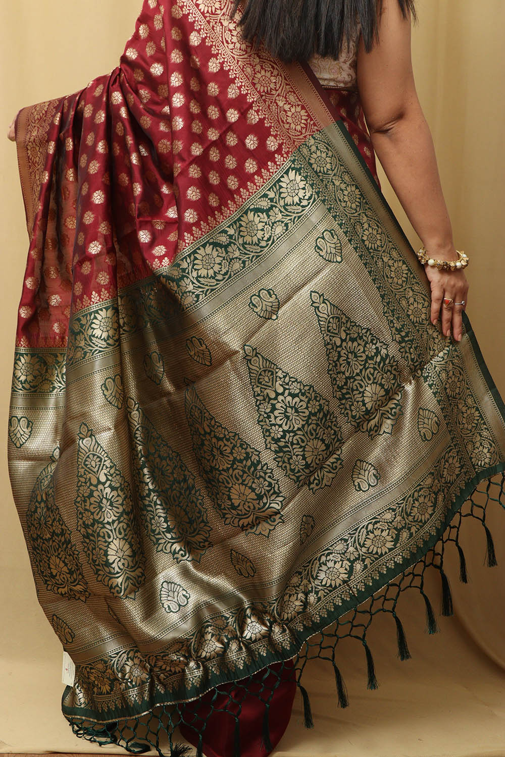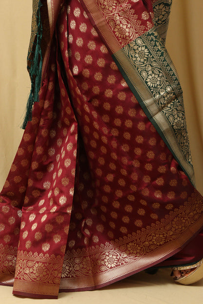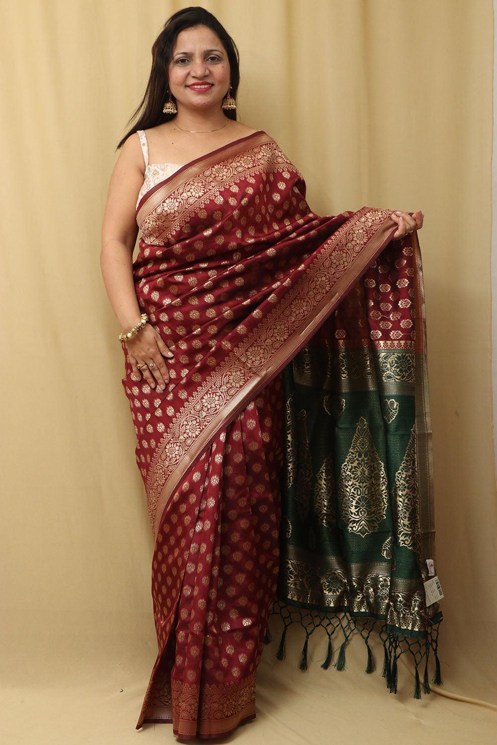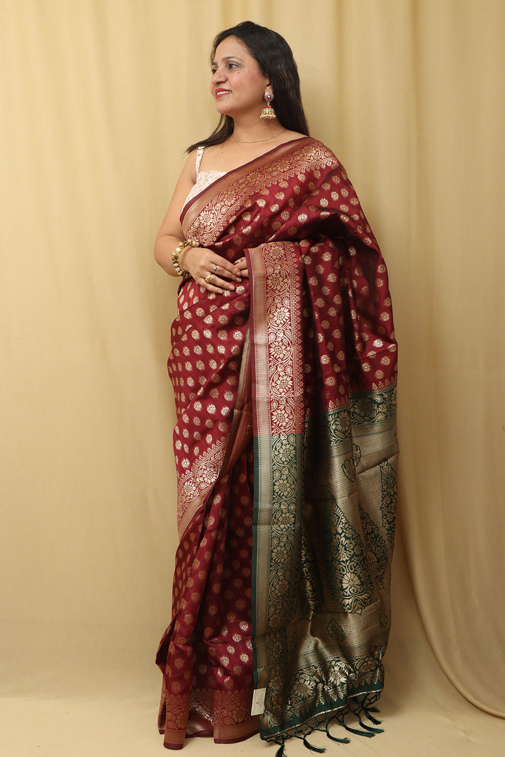 The Elegant Maroon Banarasi Cotton Silk Saree is a timeless classic that exudes sophistication and elegance. Made from a luxurious blend of cotton and silk, this saree features intricate Banarasi weaving that adds a touch of traditional charm. The rich maroon color is perfect for any special occasion, making it a versatile addition to any wardrobe. The lightweight fabric drapes beautifully, enhancing the feminine silhouette. This saree is a must-have for any woman who appreciates fine craftsmanship and exquisite design.