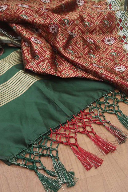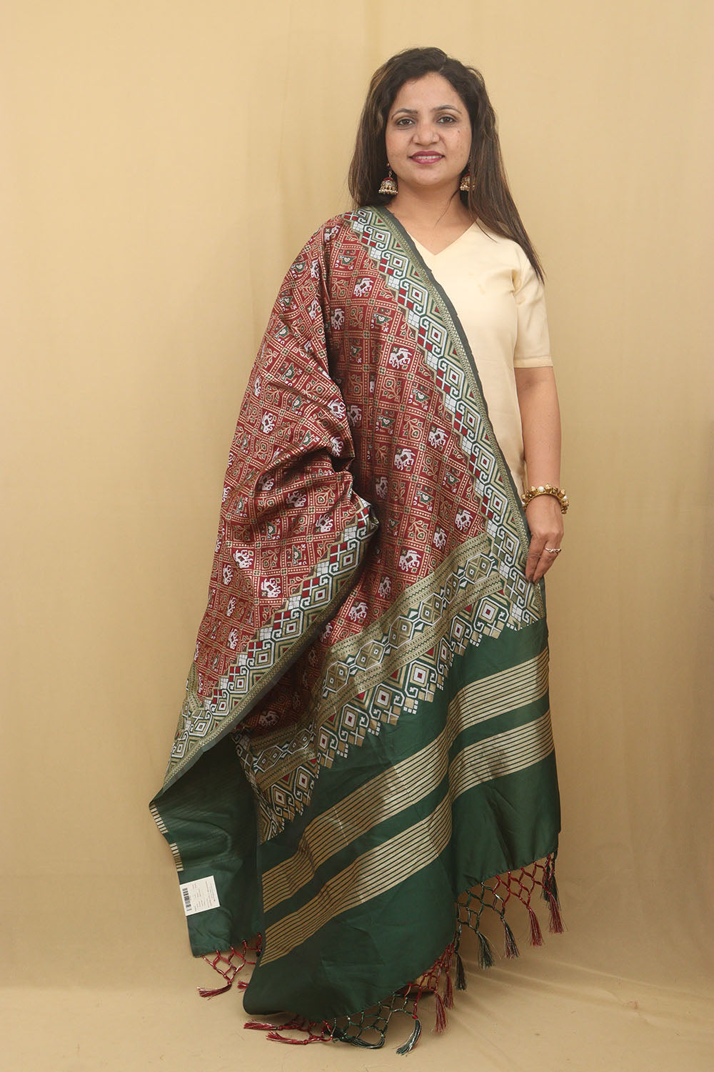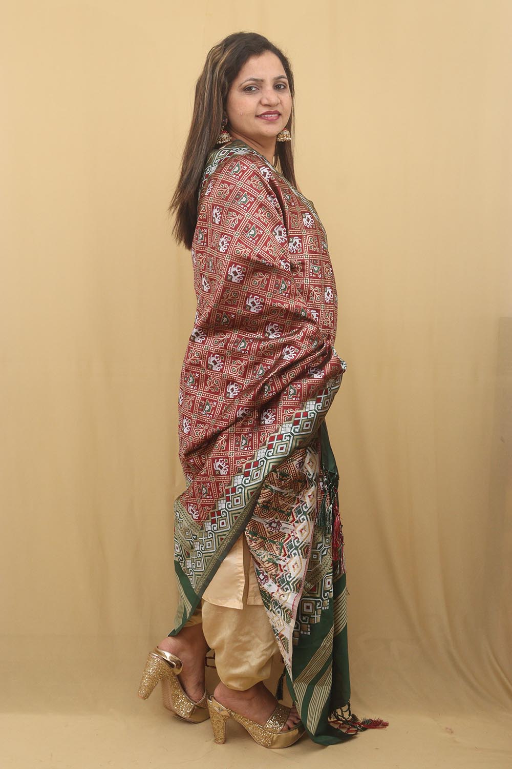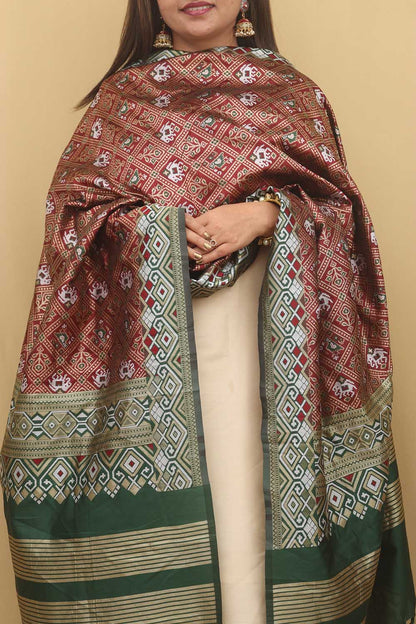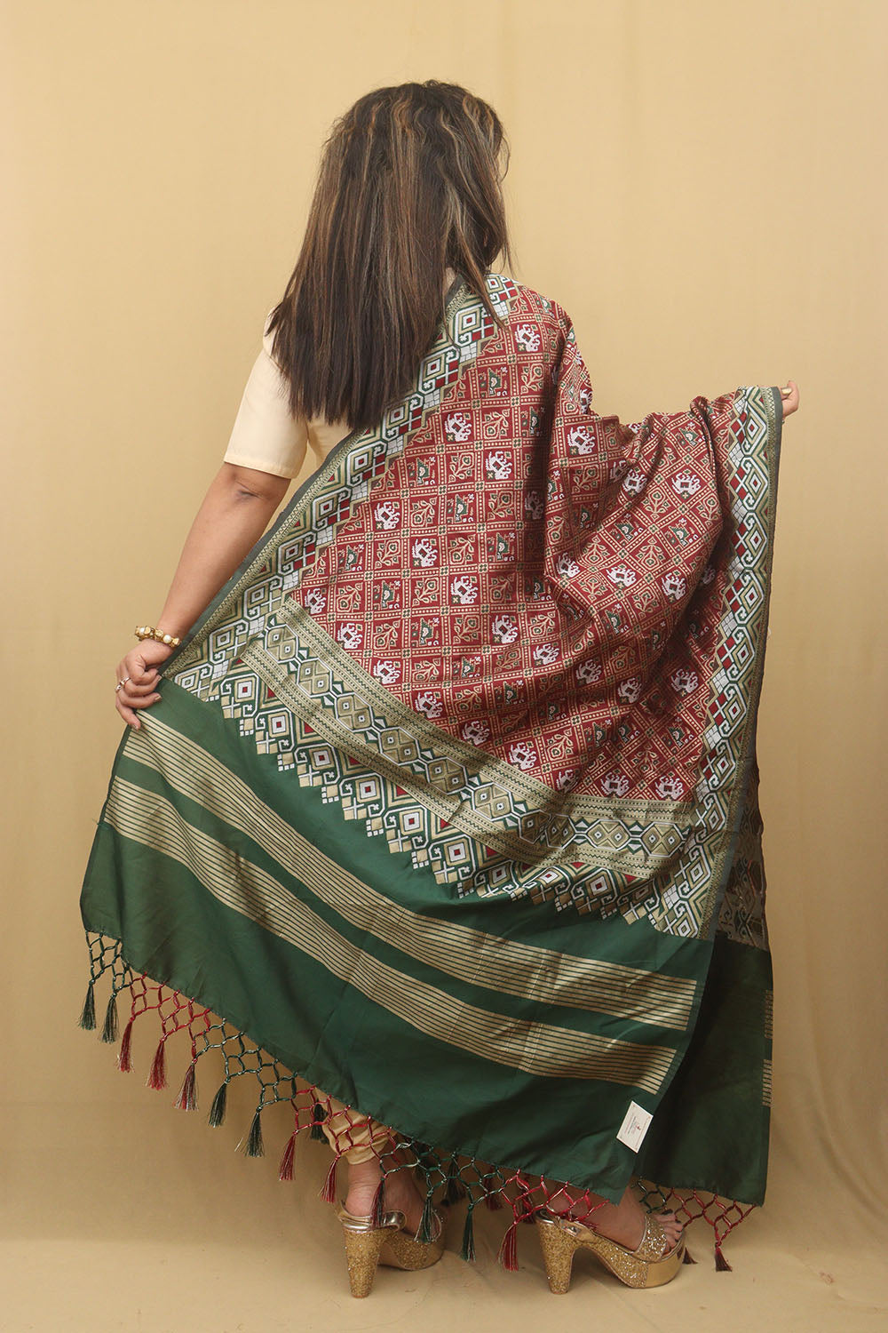 The Maroon Patola Silk Dupatta is a stunning piece of traditional Indian attire. Made from high-quality silk, it exudes elegance and sophistication. The rich maroon color adds a touch of royalty to any outfit. The intricate Patola design is handwoven by skilled artisans, making each dupatta unique and special. The lightweight fabric drapes beautifully, adding grace to your ensemble. The dupatta measures approximately 2.5 meters in length, providing ample coverage. It can be paired with a variety of outfits, from sarees to salwar suits, enhancing your overall look. The Maroon Patola Silk Dupatta is a must-have accessory for those who appreciate fine craftsmanship and timeless beauty.