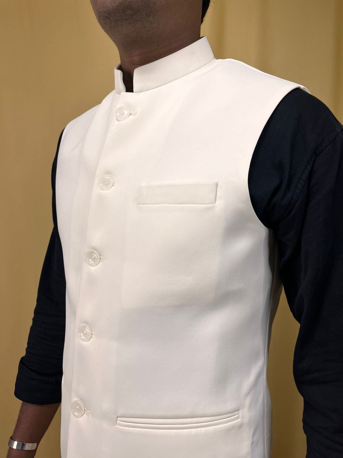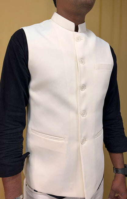Embrace effortless style and refined sophistication with our Off-White Crepe Silk Formal Nehru Jacket.