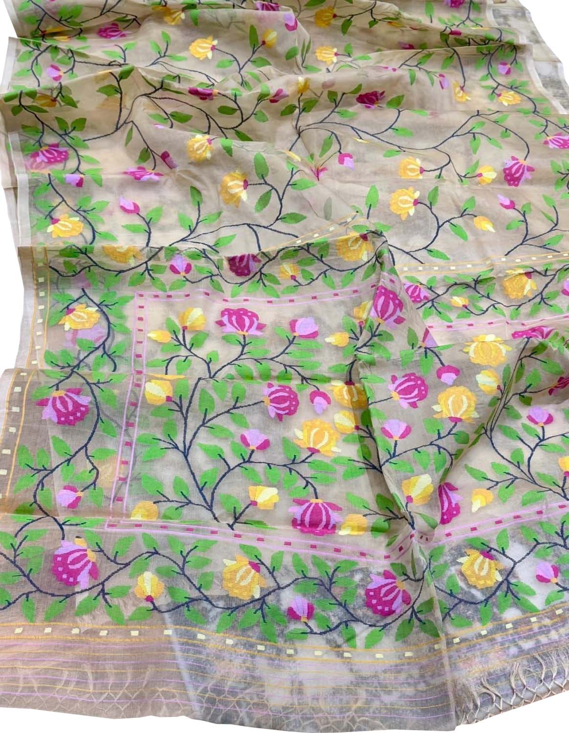 Discover the timeless elegance of this exquisite handweaved muslin Jamdani saree, adorned with intricate Meenakari detailing. Each piece showcases the masterful craftsmanship of skilled artisans, featuring delicate patterns woven into the finest muslin fabric. The multicolor palette brings vibrancy and grace to your wardrobe, making it perfect for celebrations, festivals, or special occasions. This traditional saree seamlessly blends heritage artistry with refined sophistication, offering you a garment that transcends trends and becomes a cherished heirloom.