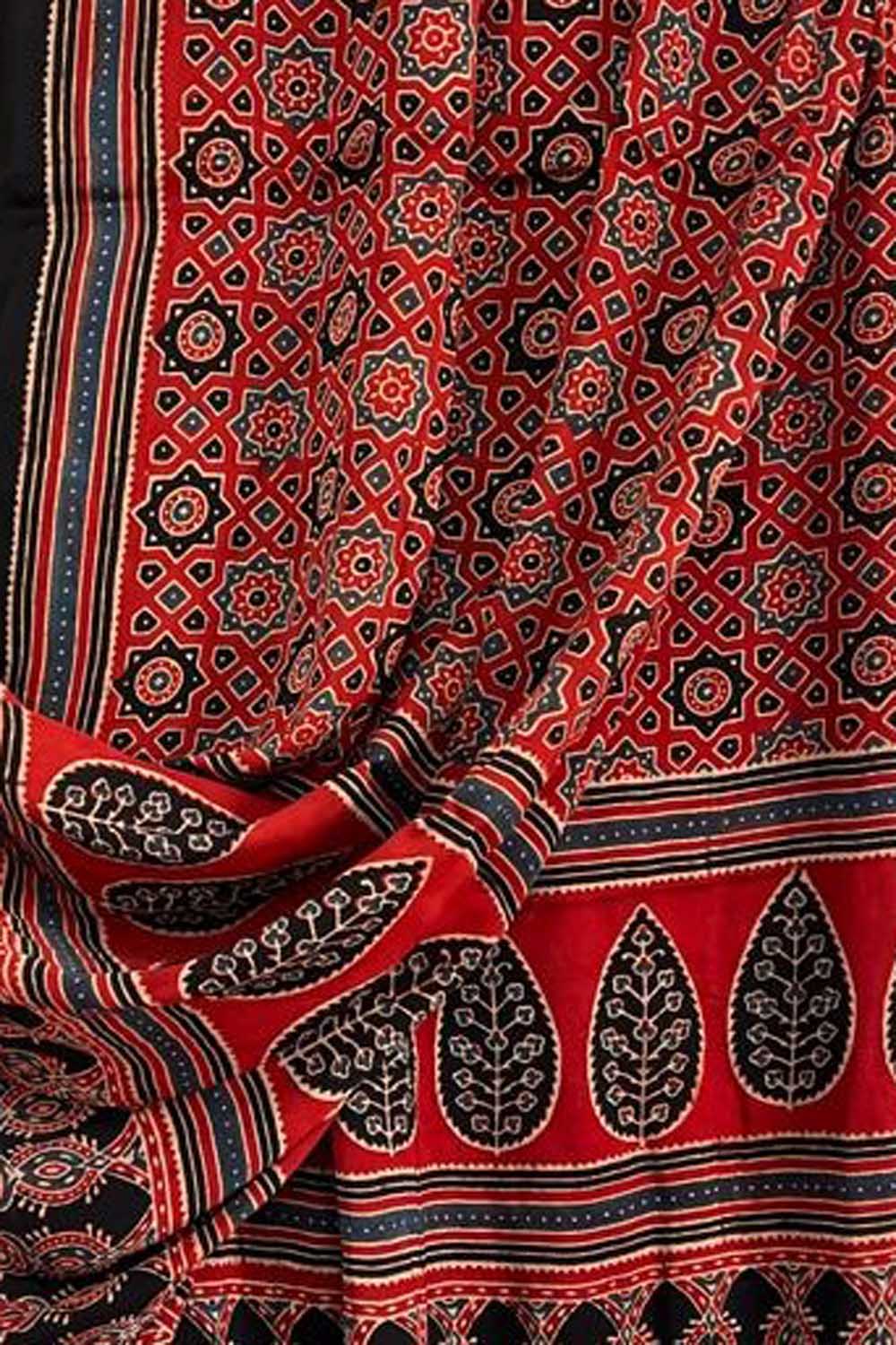 Traditionally, Ajrakh is the name of a block printed cloth with deep crimson background, bearing symmetrical patterns with interspersed unprinted sparkling white motifs.The cloth is made in a sixteen step process of washing, dyeing, printing, and drying, which requires a high level of skill and concentration in order to keep colors fast and even. The printing is done by hand with hand carved wooden blocks. Several different blocks are used to give the characteristic repeated patterning.Unlike other processes of printing on cloth, where the colour is applied directly to the cloth, in Ajrakh block printing, the fabric is first printed with a resist paste and then dyed. The entire process can take upto two weeks resulting in the creation of the beautiful eye-catching patterns of the Ajrakh.
