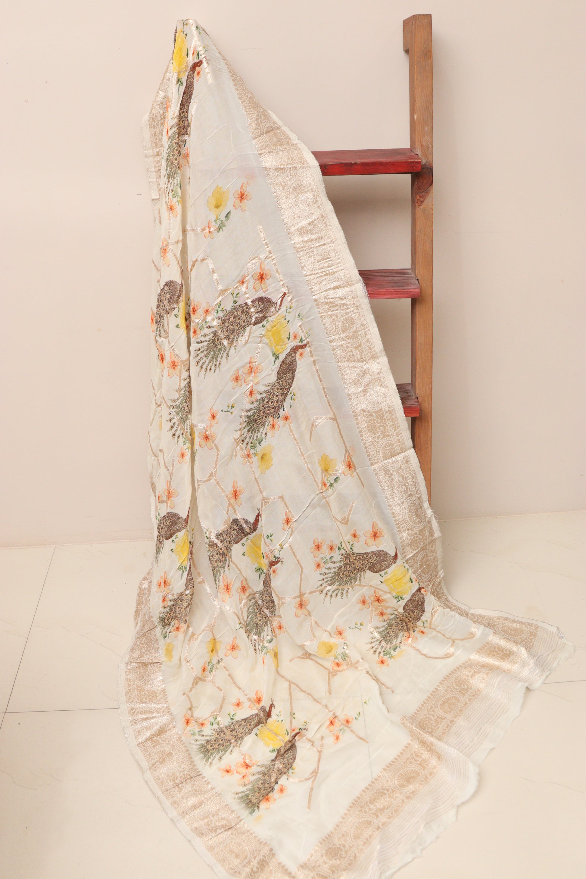 The White Banarasi Digital Printed Chiffon Georgette Dupatta is a stunning accessory that adds a touch of elegance to any outfit. Made from high-quality chiffon georgette fabric, this dupatta features intricate Banarasi digital prints in a beautiful white color. The lightweight and flowy material make it perfect for draping over your shoulders or wrapping around your neck. Its versatility allows you to pair it with both traditional and contemporary ensembles. The delicate detailing and fine craftsmanship make it a must-have accessory for any fashionista.