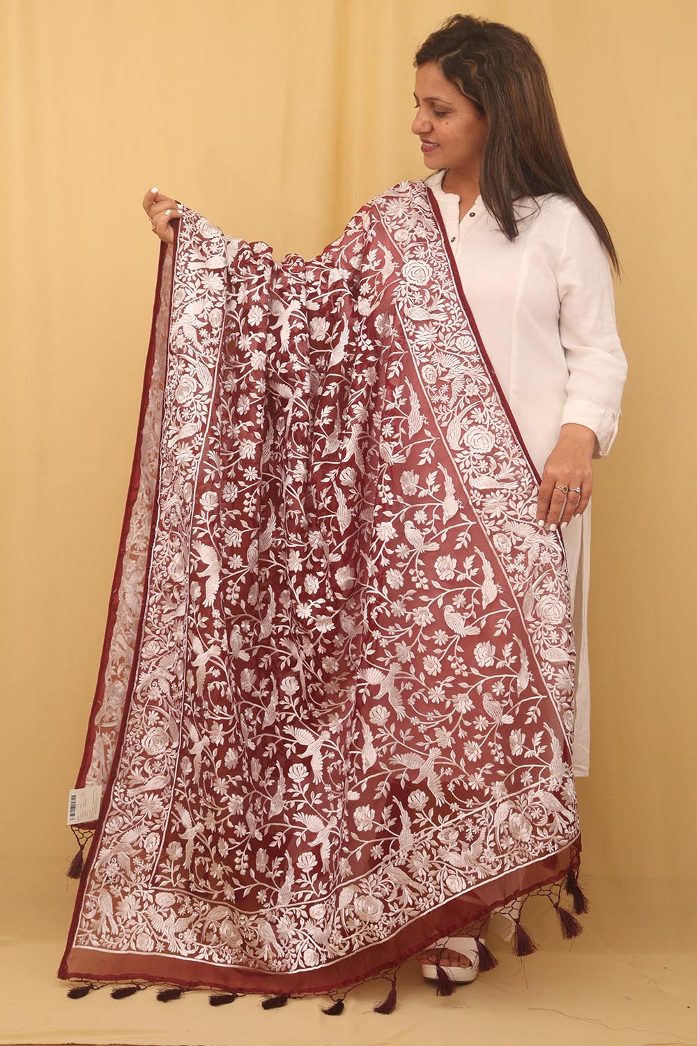 Introducing our stunning brown embroidered Parsi organza silk dupatta, the perfect accessory for any occasion! Made from high-quality silk and featuring intricate embroidery, this dupatta is sure to turn heads and add a touch of elegance to any outfit.