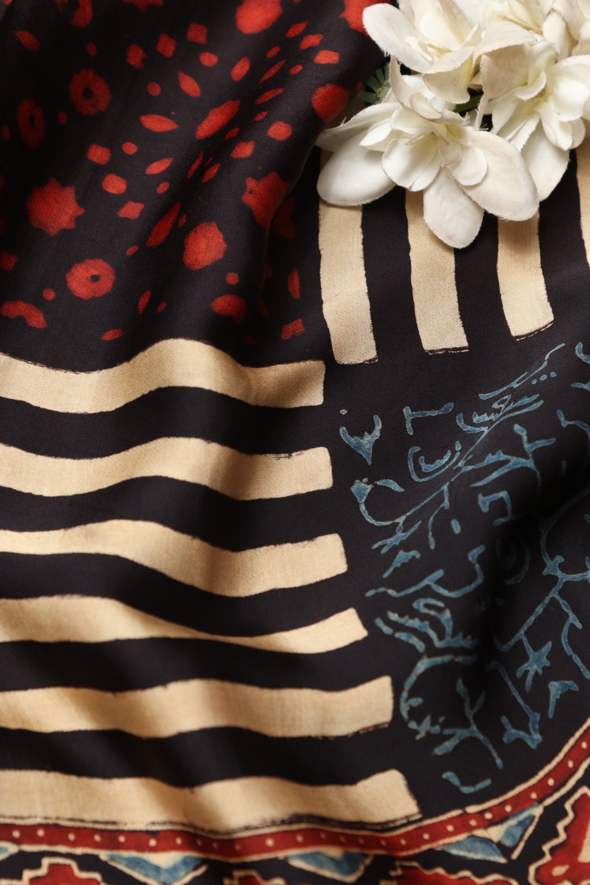 The Multicolor Block Printed Ajrakh Modal Satin Silk Fabric is a luxurious and versatile fabric that is perfect for creating stunning garments and accessories. This fabric features a beautiful multicolor block print design that is both traditional and modern, making it perfect for any occasion. The Modal Satin Silk blend gives the fabric a soft and smooth texture, making it comfortable to wear all day long. The fabric is also lightweight and breathable, making it ideal for warm weather. The unique block print design adds a touch of elegance and sophistication to any outfit.