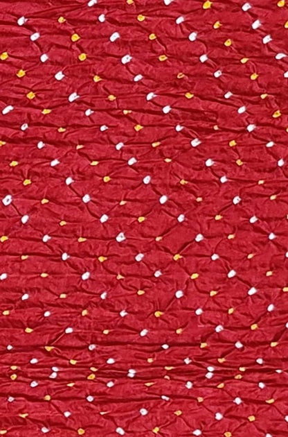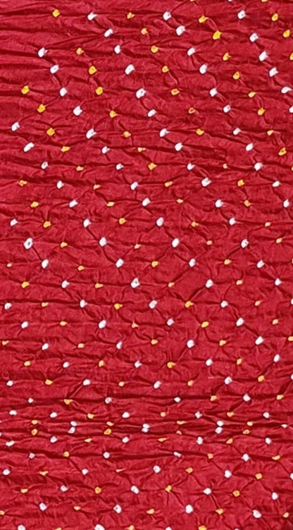 This is a Bandhani Fabric - an ideal party wear. The art of Bandhani is a highly skilled process. The technique involves dyeing a fabric, which is tied tightly with a thread at several points,thus producing variety of patterns like Leheriya, Mothra, Ekdali and Shikari depending on the manner in which the cloth is tied. Bandhani work, after the processing is over, results into a variety of symbols including, dots, squares, waves and strips. A meter length of cloth can have thousands of tiny knots .These knots form a design once opened after dyeing in bright colors.