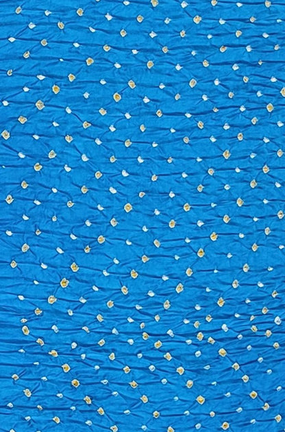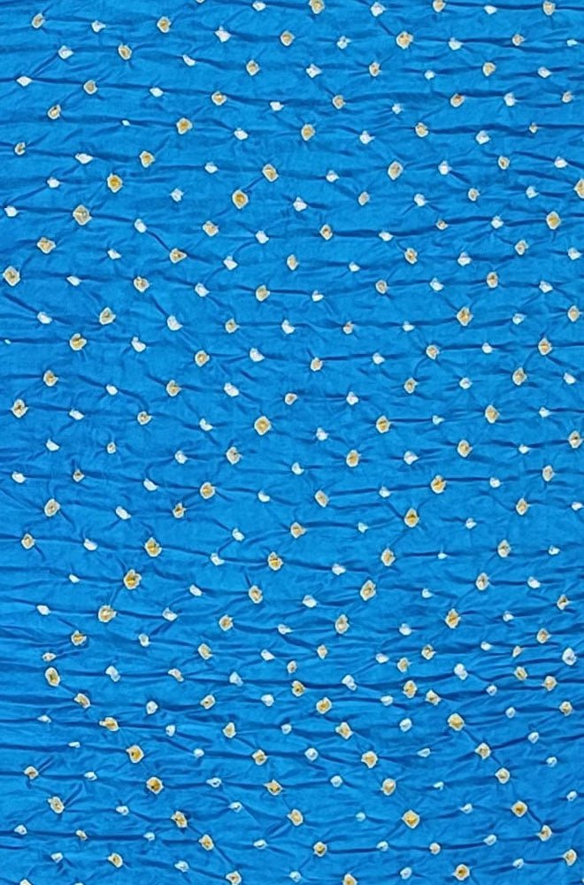 This is a Bandhani Fabric - an ideal party wear. The art of Bandhani is a highly skilled process. The technique involves dyeing a fabric, which is tied tightly with a thread at several points,thus producing variety of patterns like Leheriya, Mothra, Ekdali and Shikari depending on the manner in which the cloth is tied. Bandhani work, after the processing is over, results into a variety of symbols including, dots, squares, waves and strips. A meter length of cloth can have thousands of tiny knots .These knots form a design once opened after dyeing in bright colors.