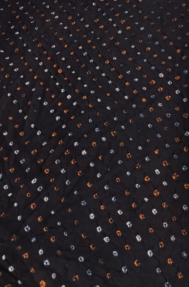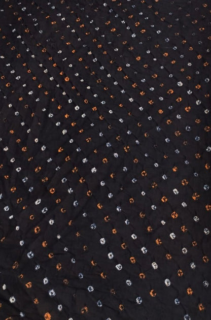 This is a Bandhani Fabric - an ideal party wear. The art of Bandhani is a highly skilled process. The technique involves dyeing a fabric, which is tied tightly with a thread at several points,thus producing variety of patterns like Leheriya, Mothra, Ekdali and Shikari depending on the manner in which the cloth is tied. Bandhani work, after the processing is over, results into a variety of symbols including, dots, squares, waves and strips. A meter length of cloth can have thousands of tiny knots .These knots form a design once opened after dyeing in bright colors.