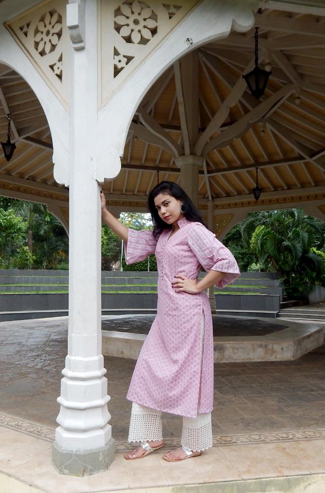 Chikankari work on powder pink hue sets the artwork from that of a great to a grand one. If you love to exude your taste for fine clothing, this suit set you are going to define your grace and trendy style. The kurta comes with a mandarin collar and V neckline with mid calf length. The bell sleeves give it a modish touch while the loop buttons detailing gives extra marks to the overall appearance. Paired with white ankle length chikankari palazzo, it makes the look quite voguish even with age old artwork display. Wear it for any occasion or purpose; you will love it for its timeless appeal.