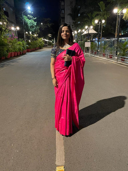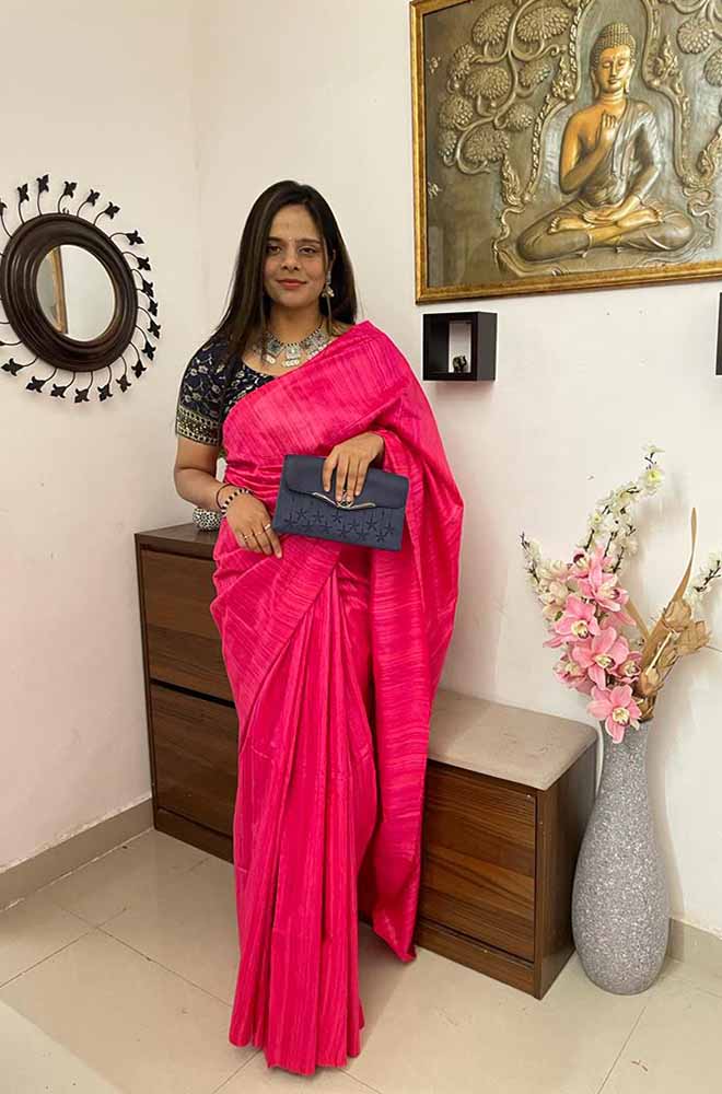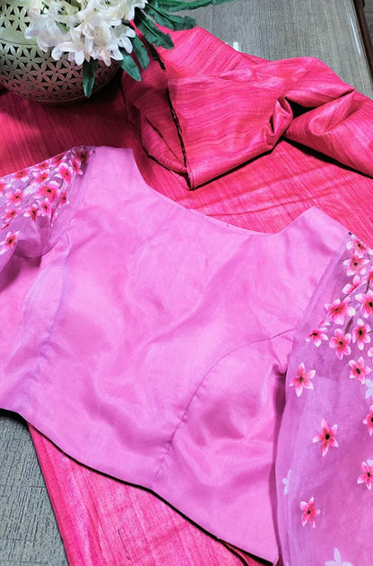 Pink Handloom Bhagalpur Pure Tussar Silk Saree With Hand Painted Pure Silk Stitched Floral Design Blouse